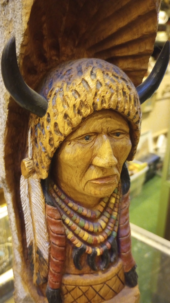 Hand carved native American sculpture measuring 14 inches tall by 5 inches wide and made by native American artist Alan F. Oviatt of Spokane, WA. Beautiful piece! I buy and trade musical instruments, diecast cars, jewelry, LP records, etc. in my shop, 'Bothell Jewelers Collectibles', 10130 Main Street, Bothell, WA. 98011, phone 425-487-2900. Hours are 11:30 to 5:30 PM Tuesday through Saturday. Call to arrange shipping.