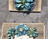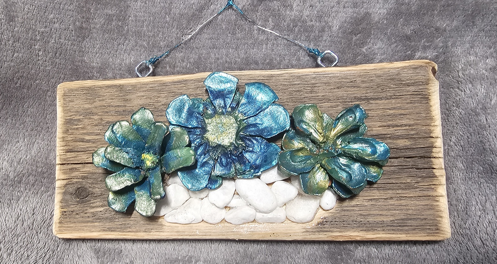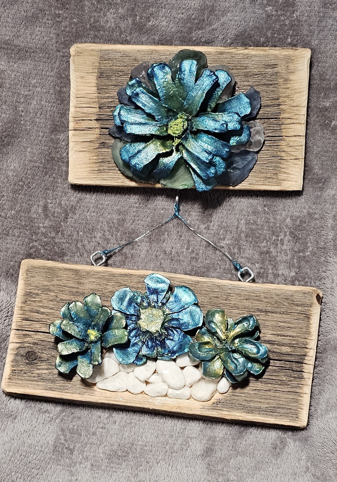 THIS IS A ONE OF A KIND HAND CRAFTED DOUBLE WALL HANGING. SHIMMERING BLUE GOLD FOREVER PINE CONE FLOWERS ON INDIVIDUAL BARNWOOD PIECES ONE ABOVE THE OTHER CONNECTED FOR A DIFFERENT KIND OF DECORATION.