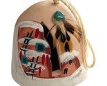 Beautiful hand-painted clay bell featuring a Southwest pueblo design, accented with natural feathers and a turquoise-colored stone. The bell has a rustic matte terracotta finish and a soft white cord with a wooden bead clapper inside. Signed ?ARA? on the interior and marked ?New Mexico? on the back, this decorative piece captures the earthy, artistic charm of Southwestern pottery.