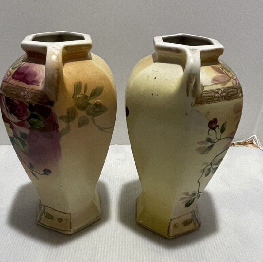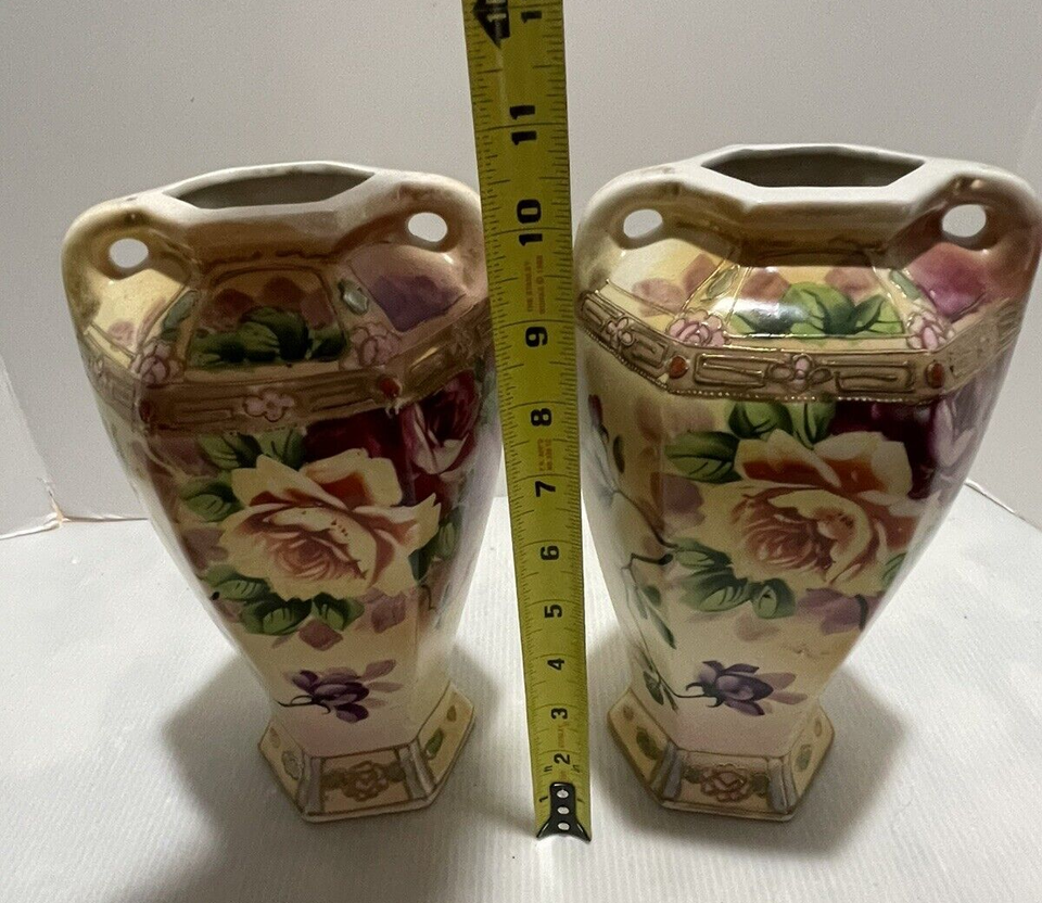 This is a 2pc striking hand-painted urn/vase from Miyako in Japan. The piece features a landscape on the front and a pink floral on the back. It is accented in gold at the base and mouth and the double handles. It is also accented with gold The piece stands 10-1/2 inches tall. The base is 4-1/4 inches in diameter. Including the handles, it is 6-1/2 inches wide.