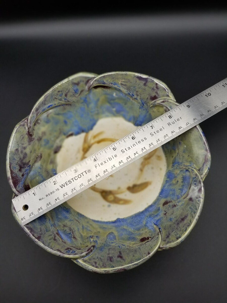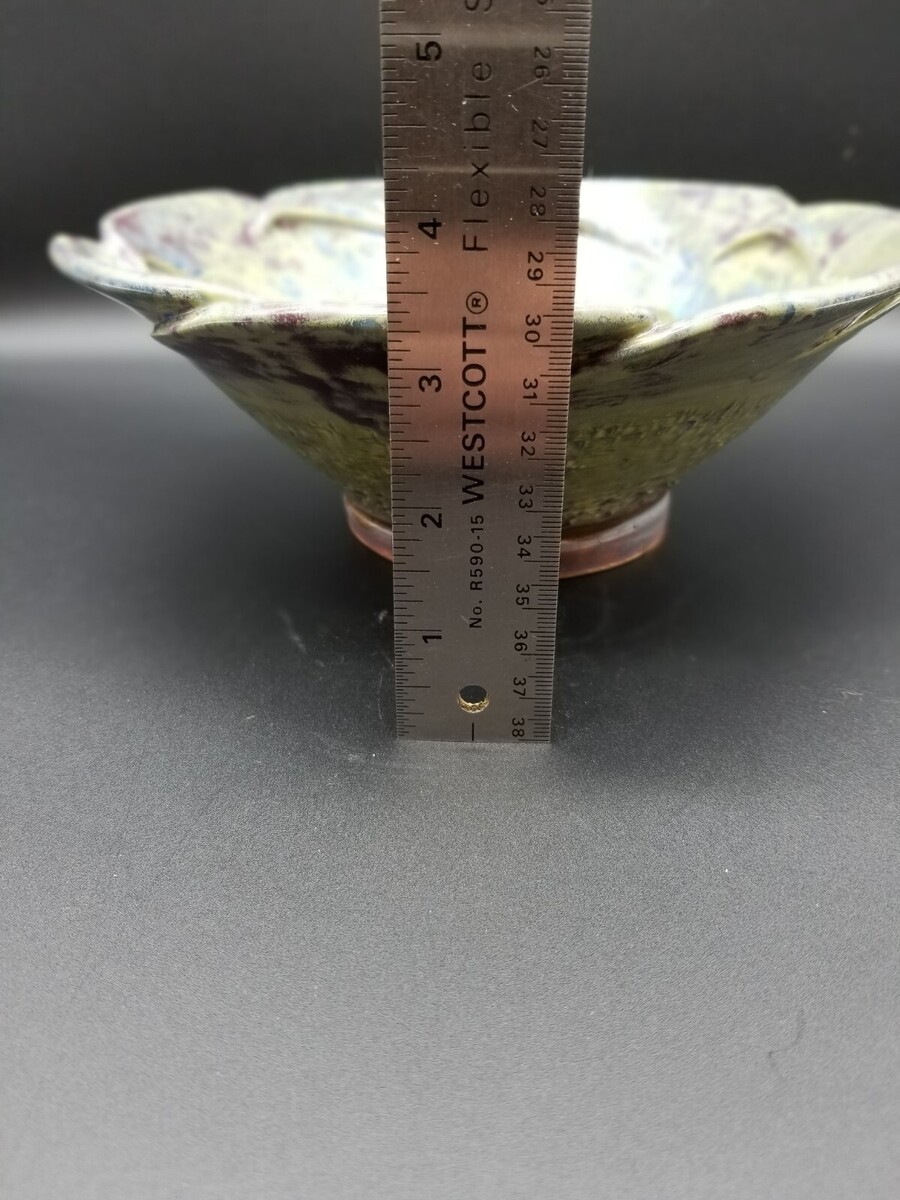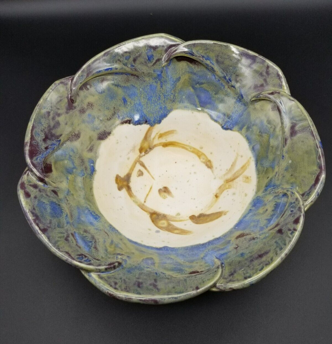 Hand Thrown Studio Art Pottery Bowl, Green/ Purple Glaze With Fish -Signed