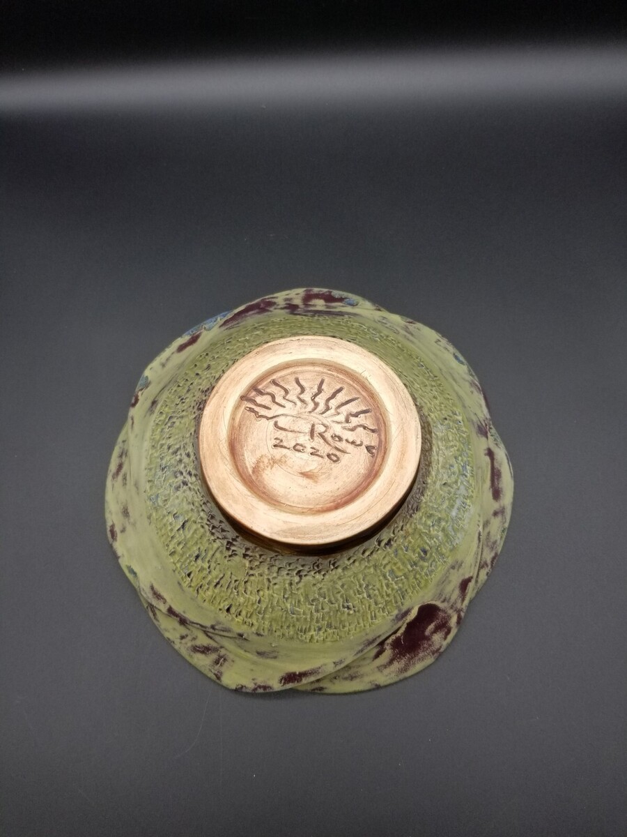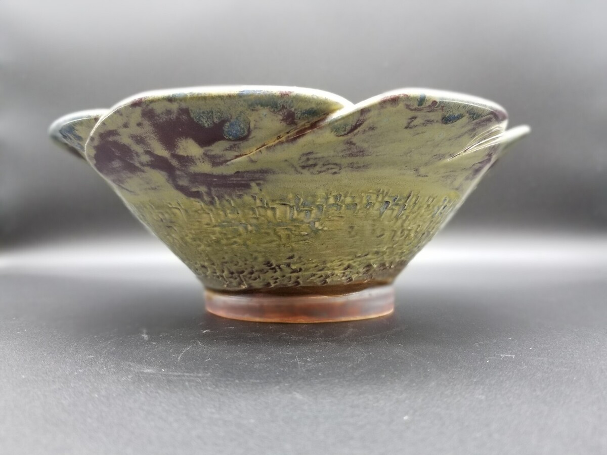- Hand Thrown Studio Art Pottery Bowl, Green/ Purple Glaze With Fish -Signed