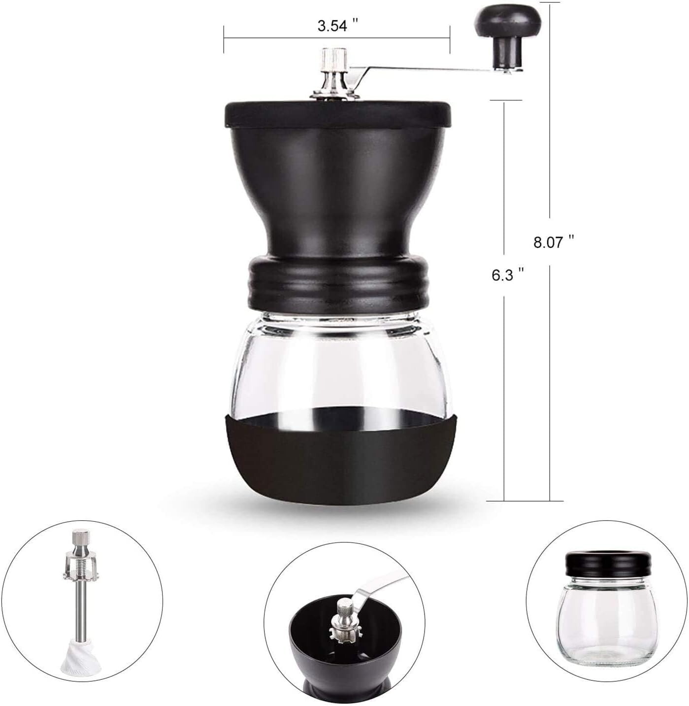 Manual coffee grinder comes with two clear glass jars, convenient to keep powders or beans during outdoors. Silicone lid is soft to touch and convenient to add beans. Nonslip silicone base keeps the coffee mill in place during grinding.