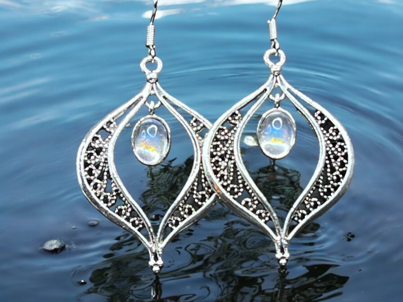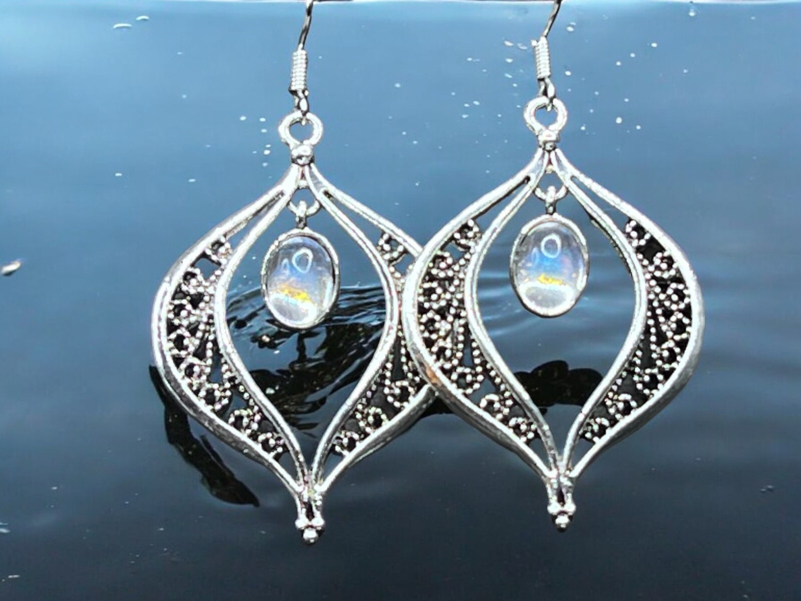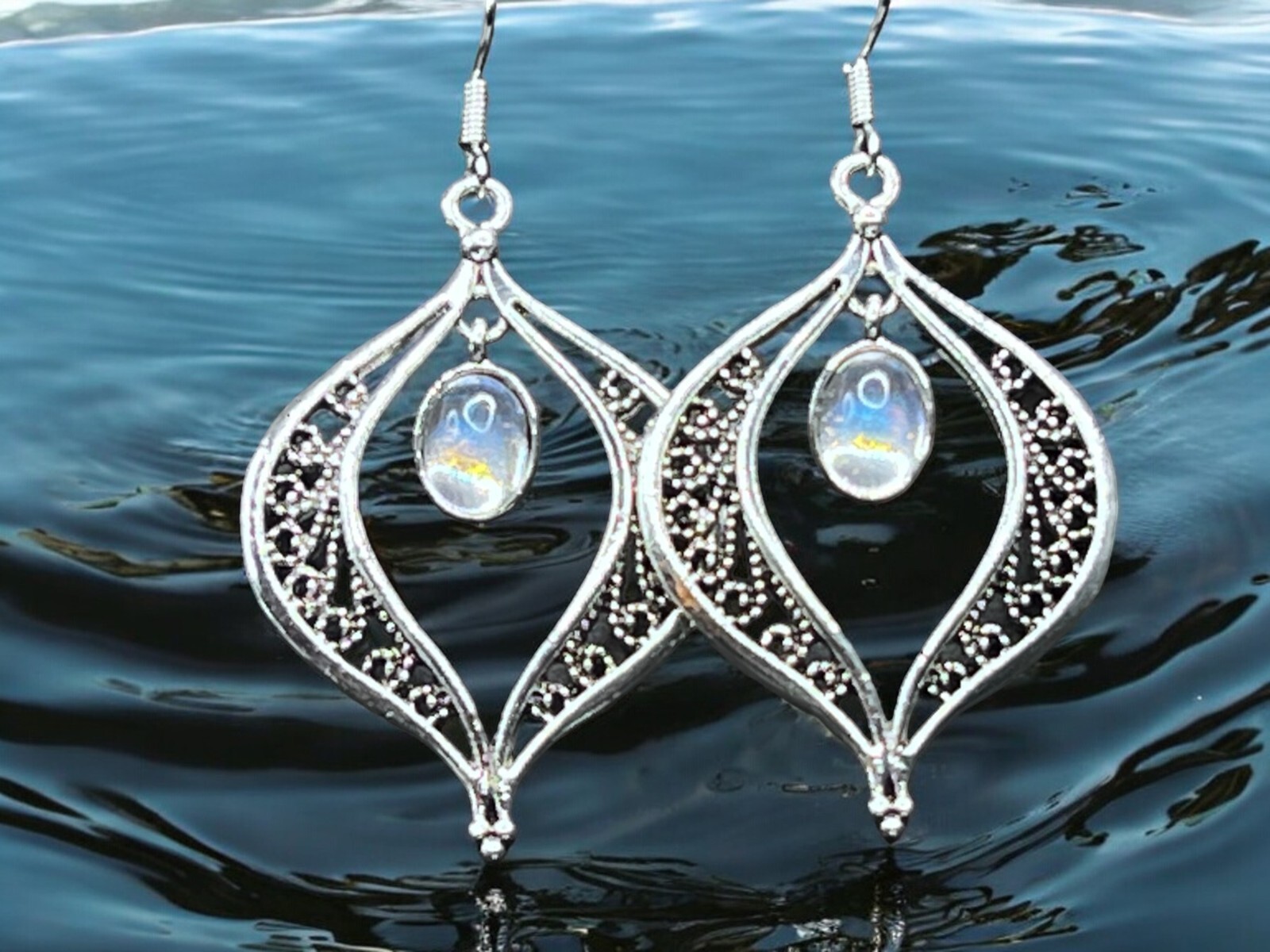 These Handcrafted Silver Dangle Earrings feature a mesmerizing blue gemstone set in an elegant swirl design. Perfect for special occasions, weddings, or daily wear, these earrings add sophistication and a pop of color to any look.