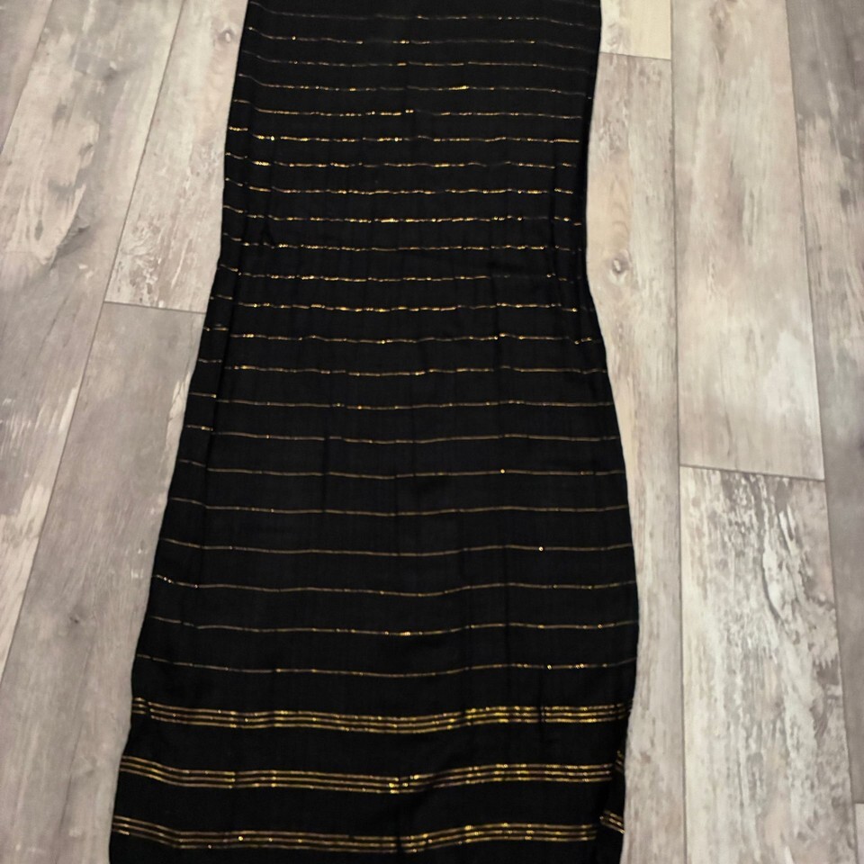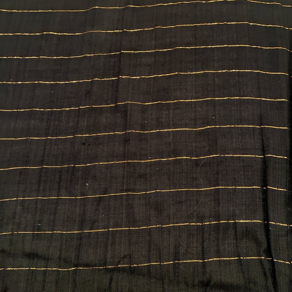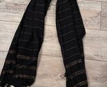 Handmade black and gold scarf with black fringe. No stains or tears. Elegant look and can be worn as an over shoulder wrap, hair/head accessory, around neck. Very versatile. 55? long x 21? wide.