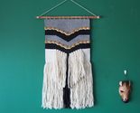 Product description: Transform your living space with this handwoven wall hanging that brings global-boho sophistication to any room. Measuring 13.8 by 27.6 inches, this Nordic modern art tapestry features striking chevron patterns in a harmonious palette of black, white, grey, and mustard that complements various decor styles. The layered textures, dynamic chevron design, and playful pompom highlights create visual movement and tactile depth, adding cozy dimension to your walls. Crafted from premium, low-shed yarns and natural wood, this lightweight tapestry comes with a sturdy wooden dowel and pre-attached cord for effortless mounting. Perfect for modern, bohemian, Scandinavian, or vintage-inspired spaces, this handcrafted piece softens modern lines in contemporary settings or enlivens midcentury rooms. Its asymmetric layers maximize visual interest while maintaining a cohesive look that works beautifully in living rooms, bedrooms, or lounge areas.