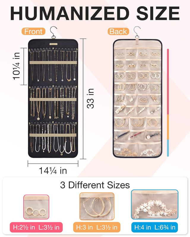 Roomy Capacity- Double-sided hanging jewelry organizer has plenty of space to store jewelry. It's designed with 32 transparent pockets to hold your rings, earrings, bracelets, watches, hairpins or other jewelry. And the other side can accommodate 42 necklaces.