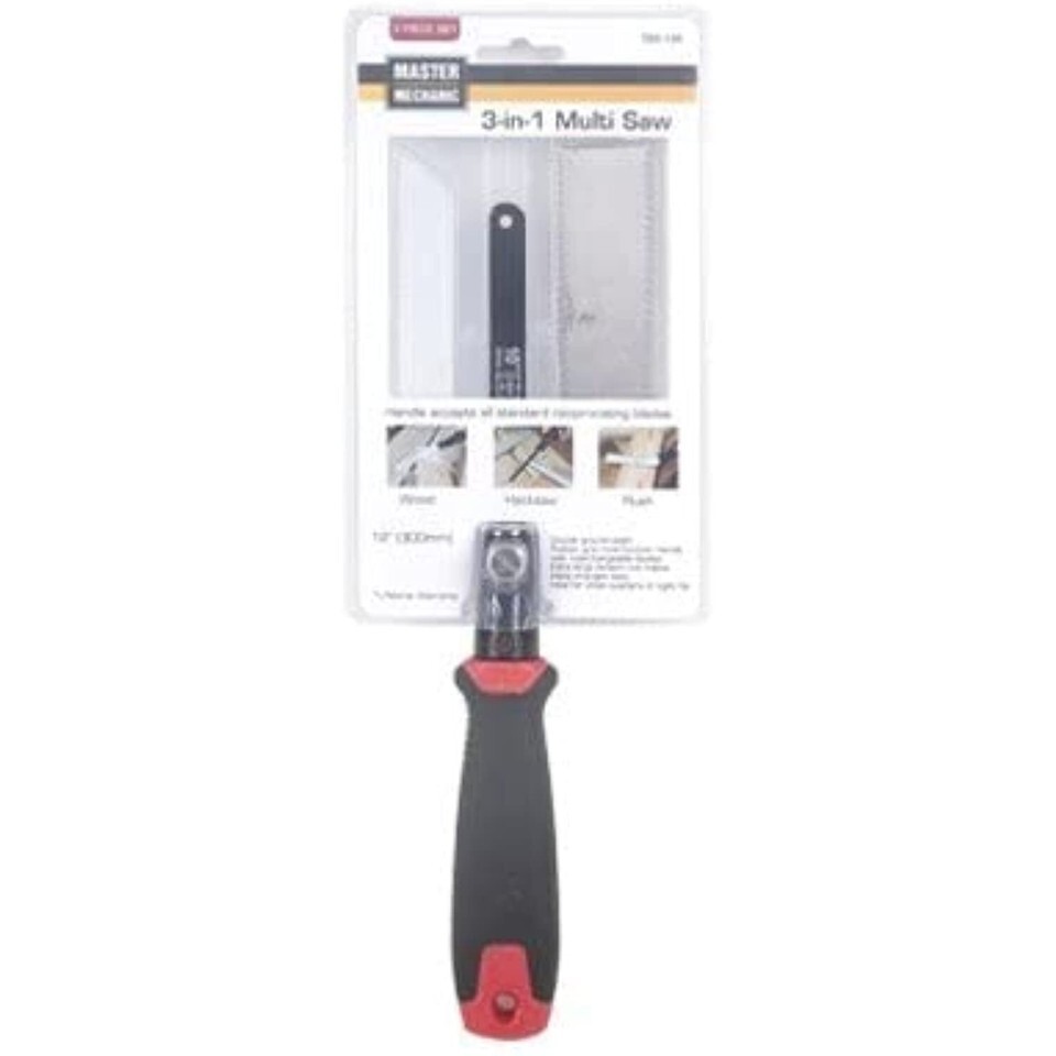 Master Mechanic, 3 in 1 Multi saw, double ground teeth, rubber grip multi-function handle with interchangeable blades, extra large tension nut makes blade changes easy, ideal for close quarters or tight fits, handle accepts all standard Reciprocating blades.