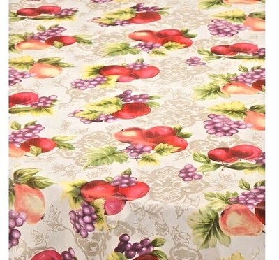 This 54 x 72-inch tablecloth features a vibrant multicolor fruit design of apples, grapes, and pears. Easy to clean. Easy to clean vinyl. Wipe clean with damp cloth.