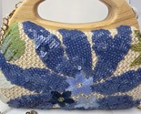 Haute Hippie Style Sequin Purse is a unique and stylish handbag crafted with a square round shape featuring a blue and light blue exterior with sequin floral embroidery with lightweight gold metal detachable chain shoulder strap making it versatile for different occasions The wooden handle adds a bohemian touch to the bag while the straw backing and sequin accents add a tropical and beachy vibe. Handmade with a polyester lining, this small to medium-sized purse is perfect for those looking for a magnetic, fun, and colorful accessory to add to their collection.