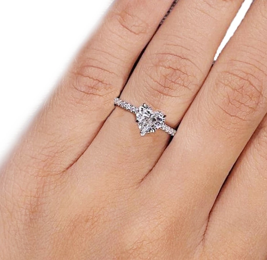 Center Stone: The centerpiece is a heart shape diamond, known for its exceptional sparkle and durability. Diamond is a lab-created that rivals diamonds in brilliance and hardness, making it an excellent choice for an engagement ring.