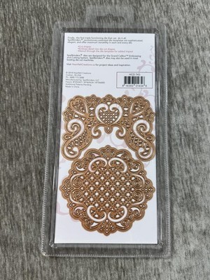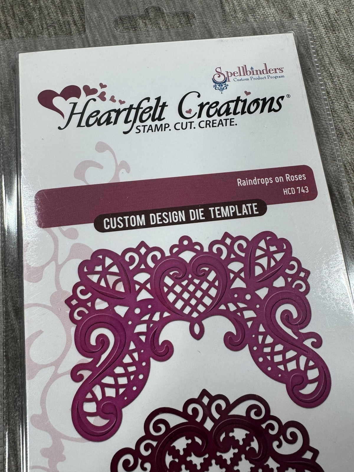 Brand: Heartfelt Creations (STAMP. CUT. CREATE.) in collaboration with Spellbinders Product: Custom Design Die Template ? Raindrops on Roses Model/Style Code: HCD 743 Includes: 2-piece metal cutting die set featuring an ornate heart border and a round lace medallion design Functions: Cut ? Emboss ? Stencil Compatibility: Use in most leading die cut systems; noted compatibility with Spellbinders Grand Calibur embossing system Appearance: Copper-tone metal dies; front card shows reference artwork in magenta Great for: Cardmaking, scrapbooking, invitations, and paper crafts UPC: 816393014346 Notes: Retail blister packaging as shown