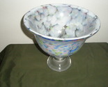 Heavy Confetti Blue Pink and White Art Glass Stemmed Bowl. It is 9 inches tall and 9.5 inches across the top. This is a very pretty bowl. Lovely colors of blue, pink, white and green. this is a heavy bowl. Please let my pictures be part of my description.