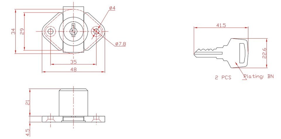 1 (One) 7/8" Keyed Alike Heavy-Duty Cam Lock + Keys Desk Drawer Mailbox Office Cabinet Brass Features 7/8" Length Cam Drawer Locks - Polished Brass Keyed Alike For plastic, wood, or metal applications Finish: Polished Brass Keyed Alike One 7/8" (22 mm) Length Heavy-Duty Cam Polished Brass Drawer Lock, Keyed Alike. Stainless Steel Face, Brass Finish, Plated Die Cast Housing Steel Cams. Can Be Mounted To Metal Or Wood Door/Drawer, Cylinder. Screws mount on 35 mm center. 180 degree angle of rotation. Length 7/8". Keyed Locking For Maximum Security. Contains 1 Lock, 2 Keys, Polished Brass Keyed Alike.