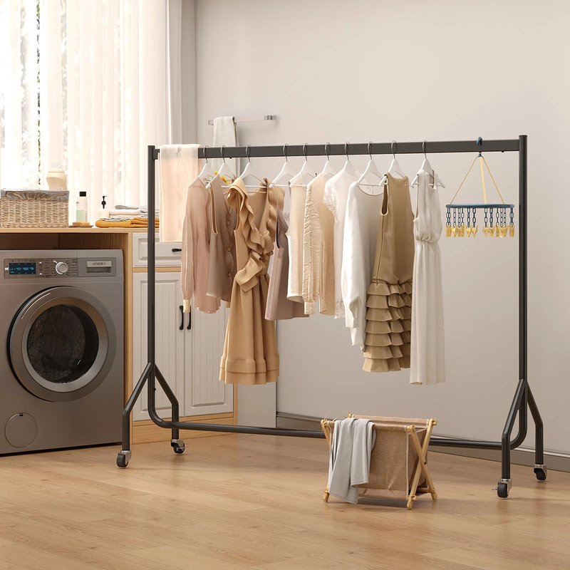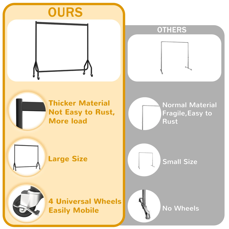 Nefoso heavy-duty rolling clothes rack is made of quality material, and surface with chrome coating, whick enhance protection against water, rust, corrosion scratch. The garment rack has a Large storage space and max load capacity is 300LBS, fulfilling clothes in different length such as maxi dresses, winter coats, T-shirt, for various user groups like women, men, children, elderly. The rolling clothing rack has four universal wheels, two of which are lockable. it can be easily moved and stop to meet your needs.Easy to assemble hanger, great for bedroom, bathroom, laundry room, as a display in a store, kids room.