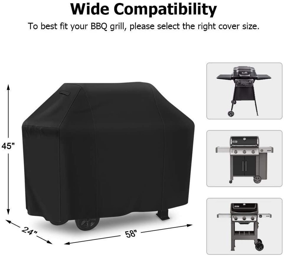 Dimension Fits for Most Brands Grills: Cover measure as 58 inch x 24 inch x 45 inch, NOT grills dimension, so it could used for almost all grills with 3 to 5 burners, and length up or less to 58 inch. Please check your grill dimensions for proper fit.