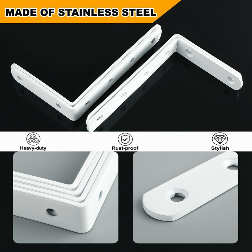 ?Compact Size?5x3 inches, ideal for small spaces without compromising on strength. ?Robust Construction?Thickened stainless steel designed for heavy-duty use. ?Stylish Appearance?Matte white finish enhances decor while providing durability. ?Versatile Use?Compatible with various materials, perfect for any shelving project. ?Complete Installation Kit?Includes all necessary hardware for a seamless setup.