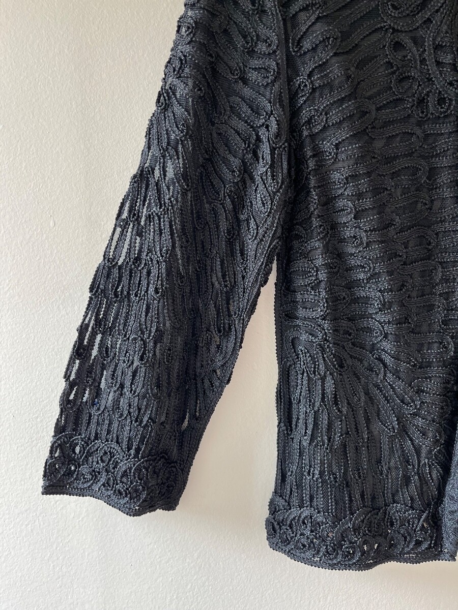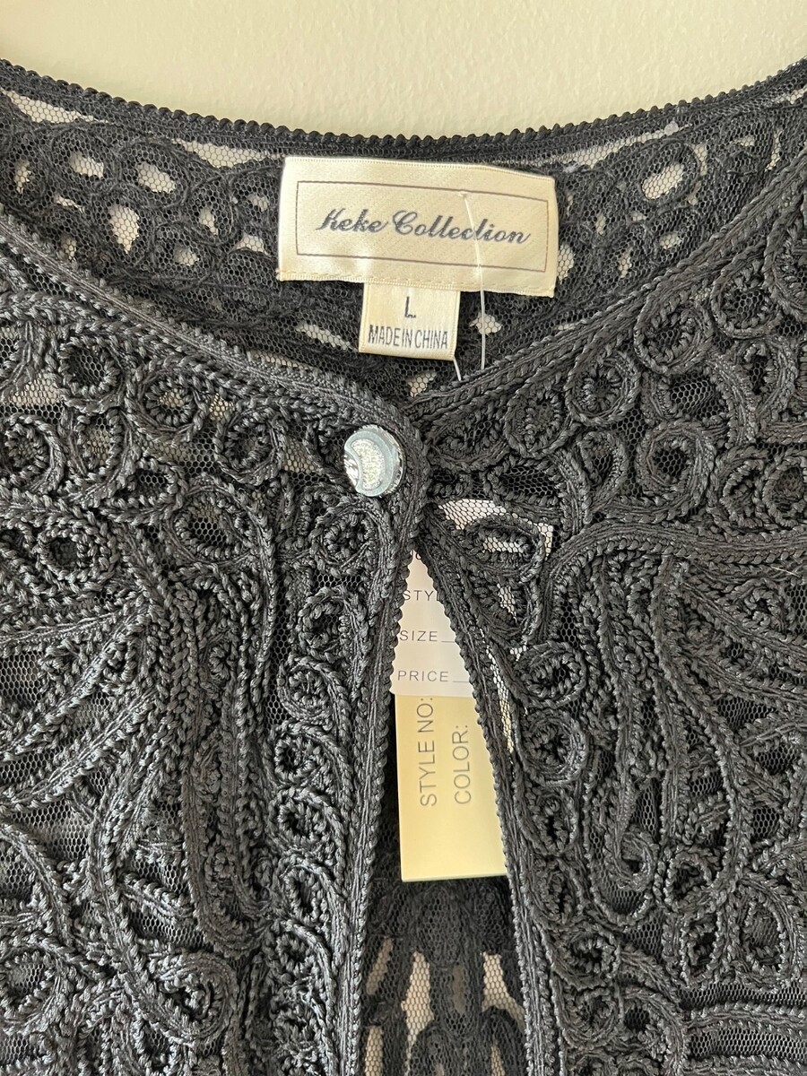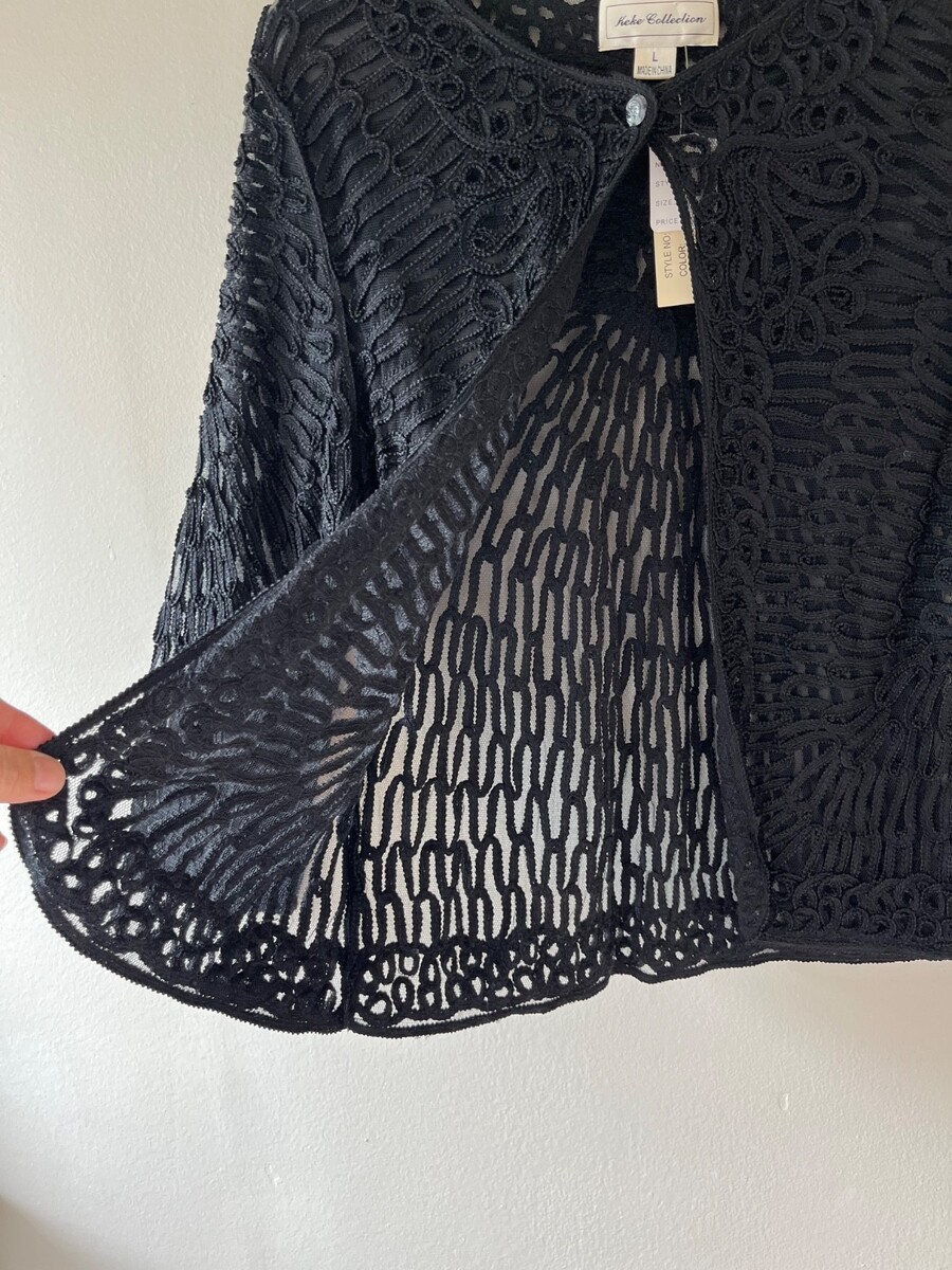 - Heke Collection Sz L Black Lace Sheer Elegant Open Cardigan Stretch One Button
