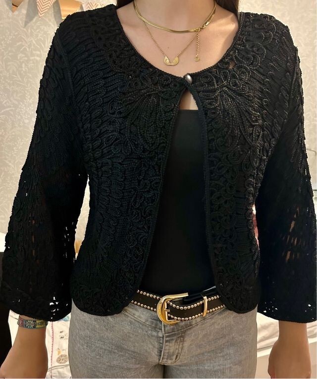 Heke Collection Sz L Black Lace Sheer Elegant Open Cardigan Stretch One Button