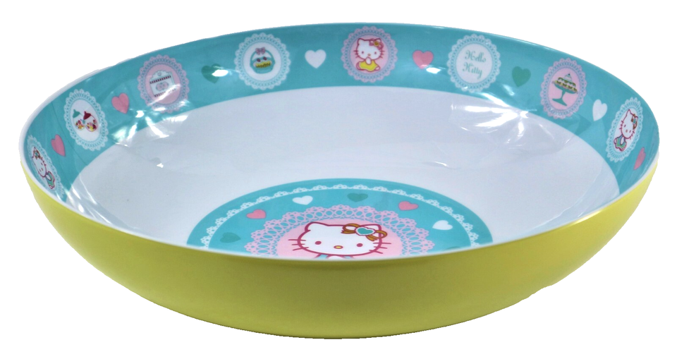 - Hello Kitty Multipurpose Bowl. - Beautiful design. - Multipurpose use. - Size: 12 X 3 1/2 inches | 30.0 x 8.8 cm (Approx). - Material: 100% Melamine. - Heat resistant to 248 degrees fahrenheit |120 degree celsius | To | -4 degrees fahrenheit | -20 degrees celsius. -UPC #881780162030. - Original Sanrio product.