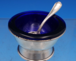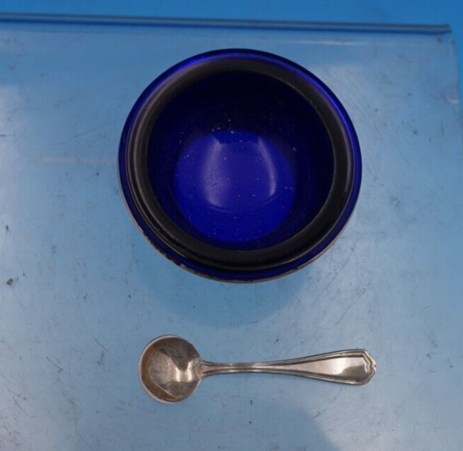 Wonderful Hepplewhite by Reed and Barton sterling silver salt dip with a beautiful cobalt liner (no marks observed on #2 salt dish; came in as a set with spoon). The salt dip measures 1 1/4" x 2" and weighs .41 troy ounces (without liner). The spoon measures 2". The pieces are not monogrammed are in good estate condition as shown. Fantastic!