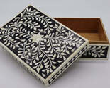Add a touch of refined elegance to your vanity with this Heritage bone Inlay Jewelry Box in Black. Handcrafted by skilled Indian artisans, this piece features intricate mother of pearl inlay work, creating a delicate and timeless floral pattern that glistens softly against a warm beige background.