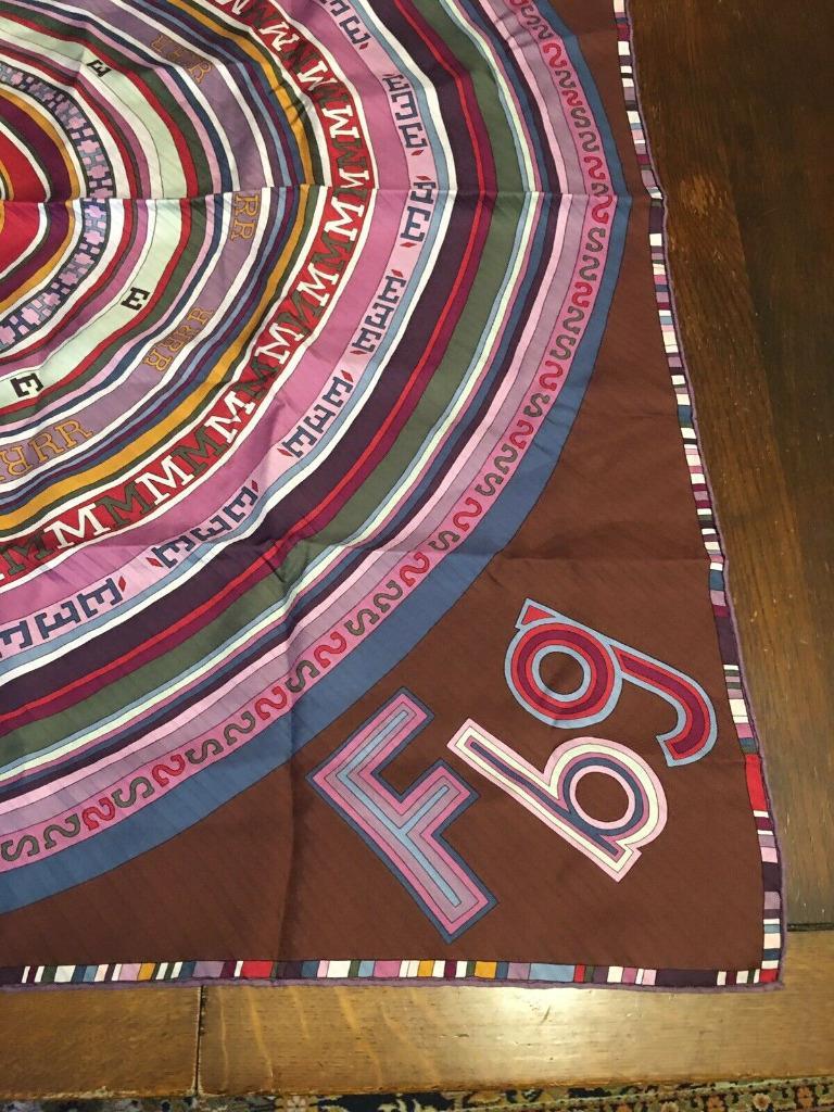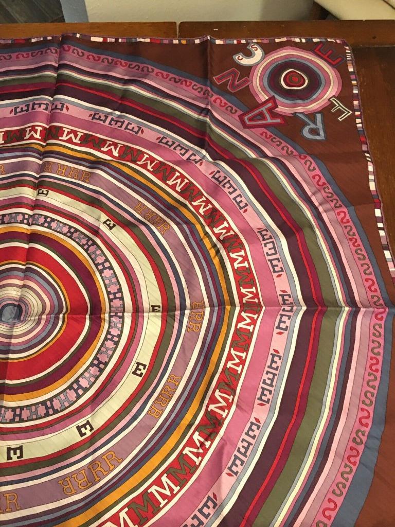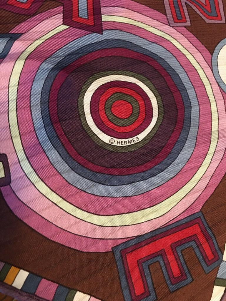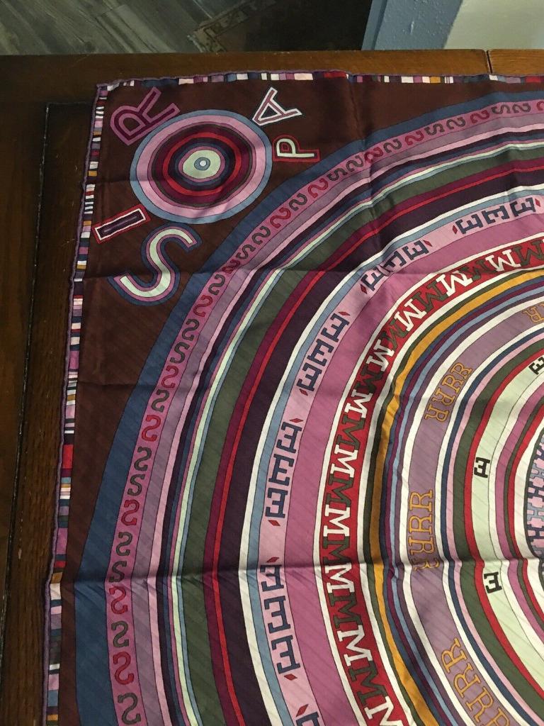 This scarf is in excellent condition, the hand-stitched hem is plump. The background is prune/ brown, with the patterns in lilac, pink and blue.