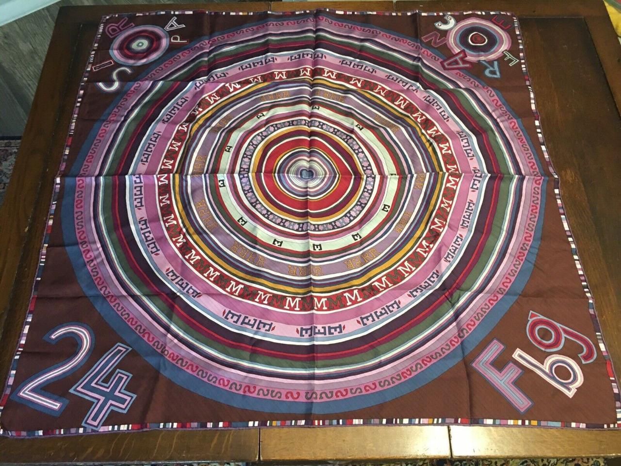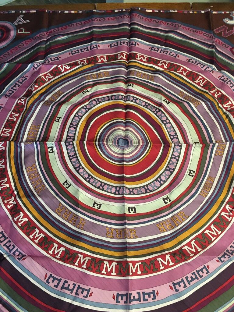 Claudia Stuhlhofer-Maier constructed her design on the principle of the mandala ? a geometric diagram used for meditation and invoking the gods. Its colours and concentric circles symbolize the structure of the universe. This scarf is a mandala for the god, Hermes.
