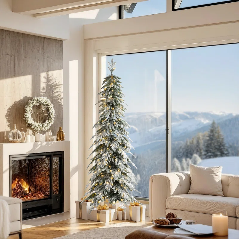Bring the look of a winter wonderland into your home with this artificial Christmas tree. Its slender, flocked branches mimic a spruce, creating a frosted look. Made using PVC PE blend with hinged branches, it's pre-lit with numerous warm LED lights that stay on even if one bulb goes out. This faux Christmas tree also includes a metal stand for stability and is easy to set up with its plug-in design. With multiple branch tips, there's a lot of space for your favorite ornaments and strings of garland.