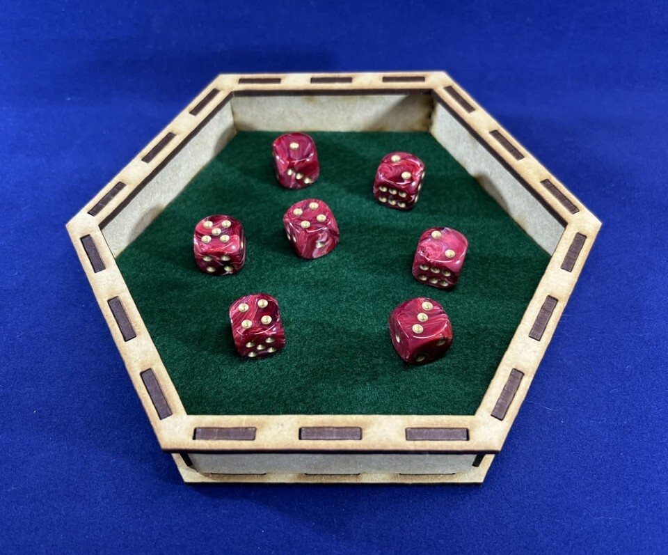 Atomic Laser Cut Designs Upgrade your tabletop or role-playing game setup with this precision-cut hexagonal MDF dice tray! Measuring 178mm (7 inches) across, this sturdy tray keeps your dice rolls contained and your table scratch-free. Its clean laser-cut design and natural MDF finish make it perfect for painting, staining, or leaving as-is for a rustic look. Great for D D, Warhammer, Pathfinder, or any tabletop RPG or board game. Easy to assemble, compact and durable. Precut felt included ? a must-have for any gamer who wants to roll in style! Dice are not included.