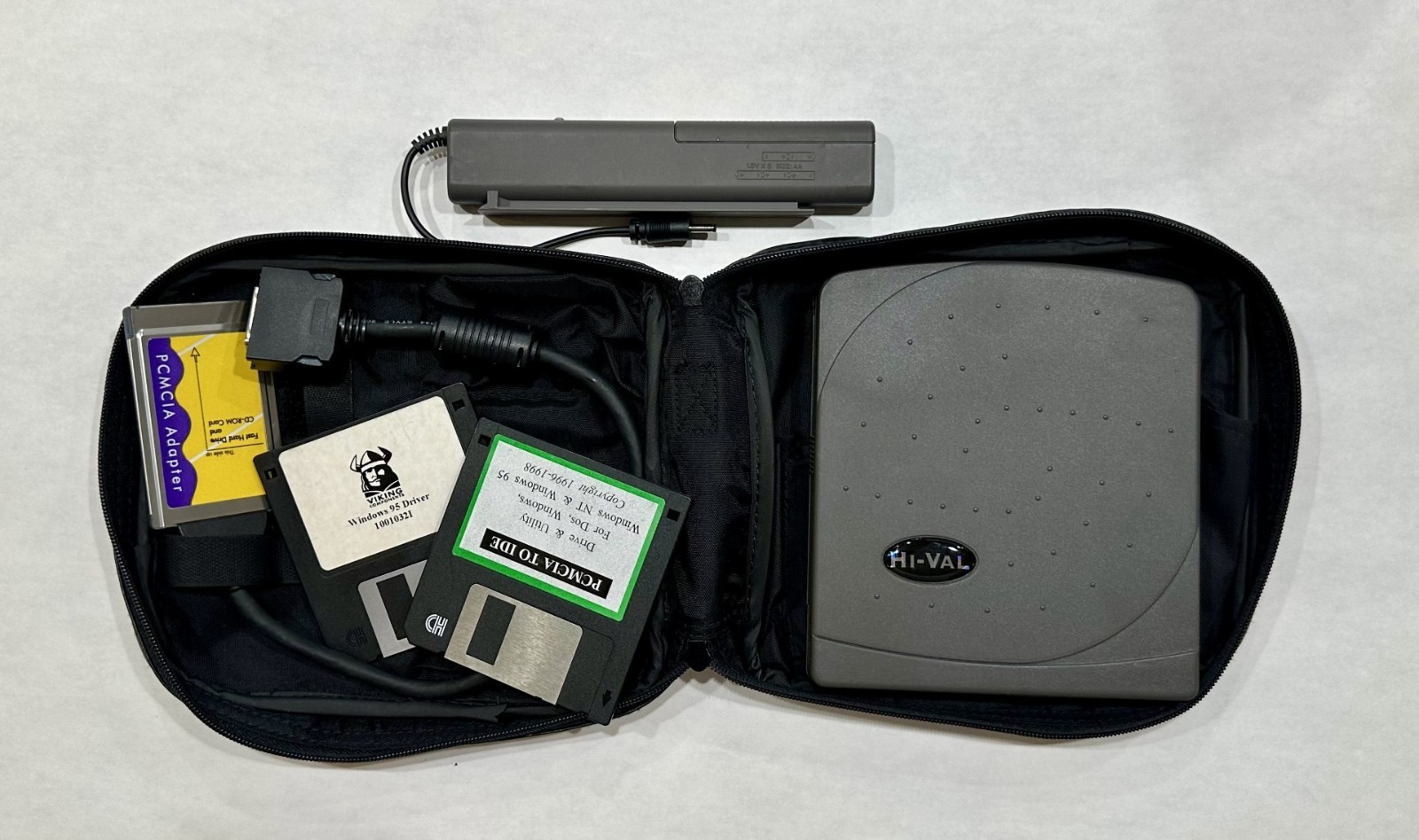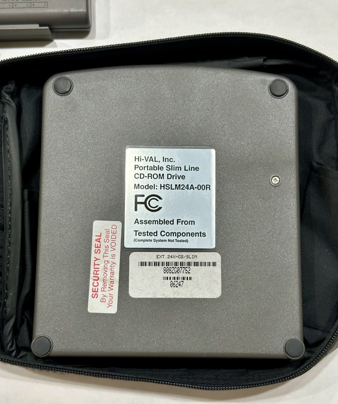 ?? Item Description: Description: Vintage Hi-Val Portable Slim Line CD-ROM Drive, model HSLM24A-00R, complete with original accessories and carrying case. Includes power adapter, PCMCIA adapter, connecting cable, and driver disks (Windows 95 / NT / DOS). This set comes in its original padded black zippered case with wrist strap ? perfect for collectors, retro computing enthusiasts, or restoring vintage laptops. Included in this listing: Hi-Val HSLM24A-00R Portable Slim Line CD-ROM Drive Power adapter PCMCIA Adapter interface cable (2) Driver / Utility floppy disks Carrying case with handle strap Features: External portable CD-ROM drive Model: HSLM24A-00R Interface: PCMCIA (Type II CardBus) Power source: AC adapter (included) Speed: 24X Plug-and-play compatibility with Windows 95 / 98 / NT / DOS Compact and lightweight ? ideal for laptop use Condition: Preowned, clean, and well-kept vintage condition. Untested (sold as-is due to age). Case and cables in excellent shape; includes original accessories as shown.