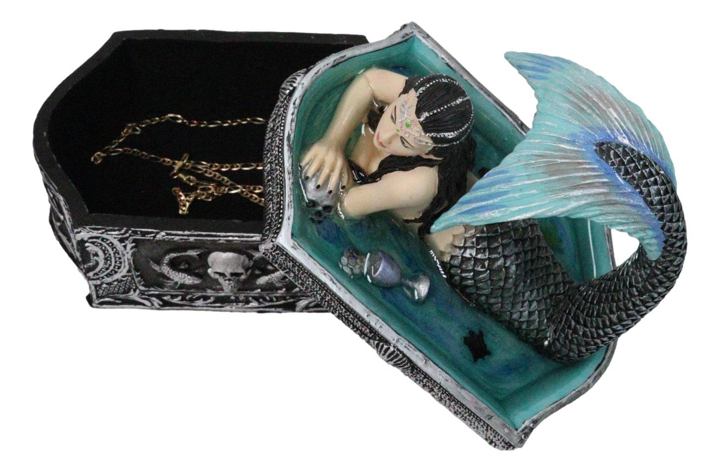 ? Dive into dark ocean mystique with this Siren Mermaid on Still Water Necromancy Skull Decorative Box Figurine. Expertly crafted with intricate detail, it features a haunting siren mermaid resting upon calm waters, entwined with a mystical skull motif box that evokes themes of necromancy and the deep unknown. Both a functional storage box and striking fantasy decor accent, this piece is perfect for holding jewelry, keepsakes, or small treasures.