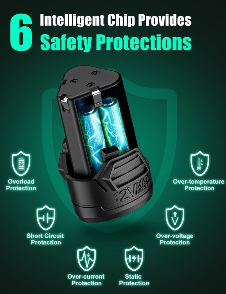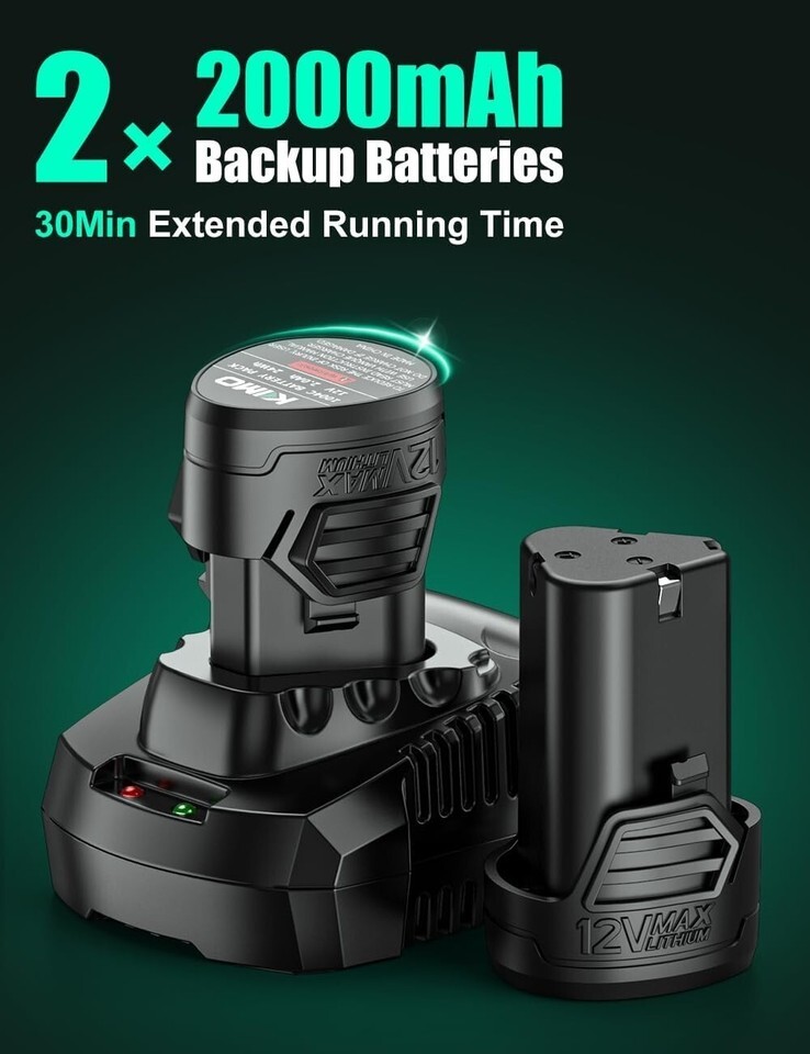 Dual Battery Backup: Includes 2 Pack of 12V 2.0Ah batteries for seamless power swapping and extended use.