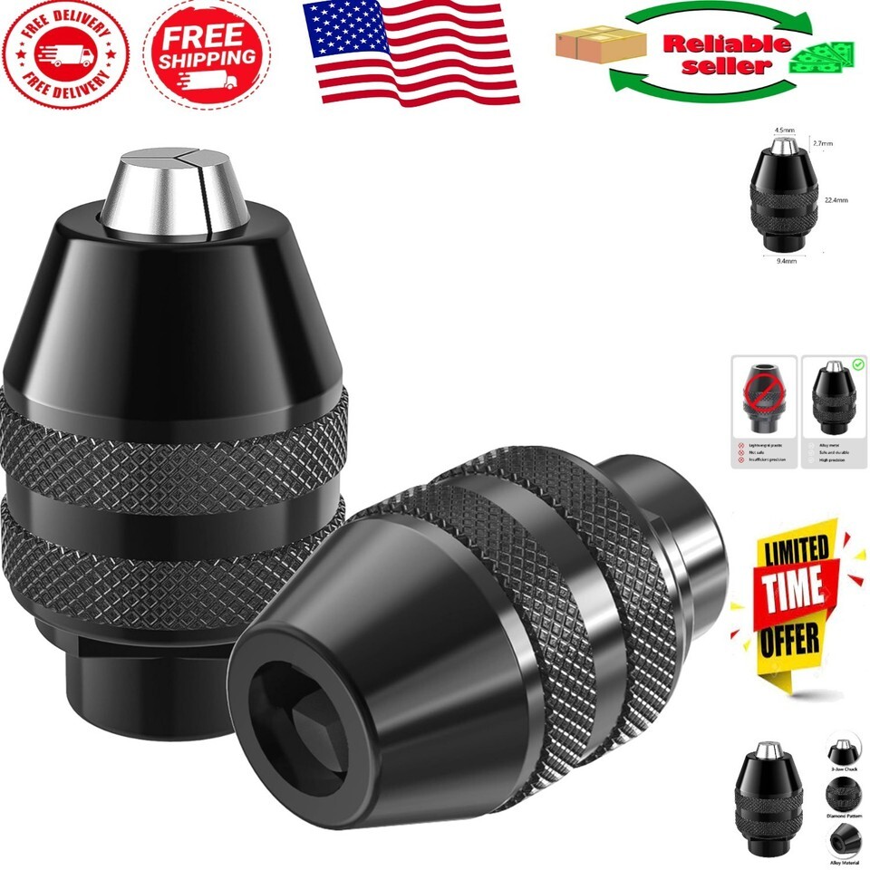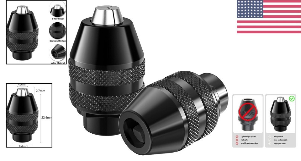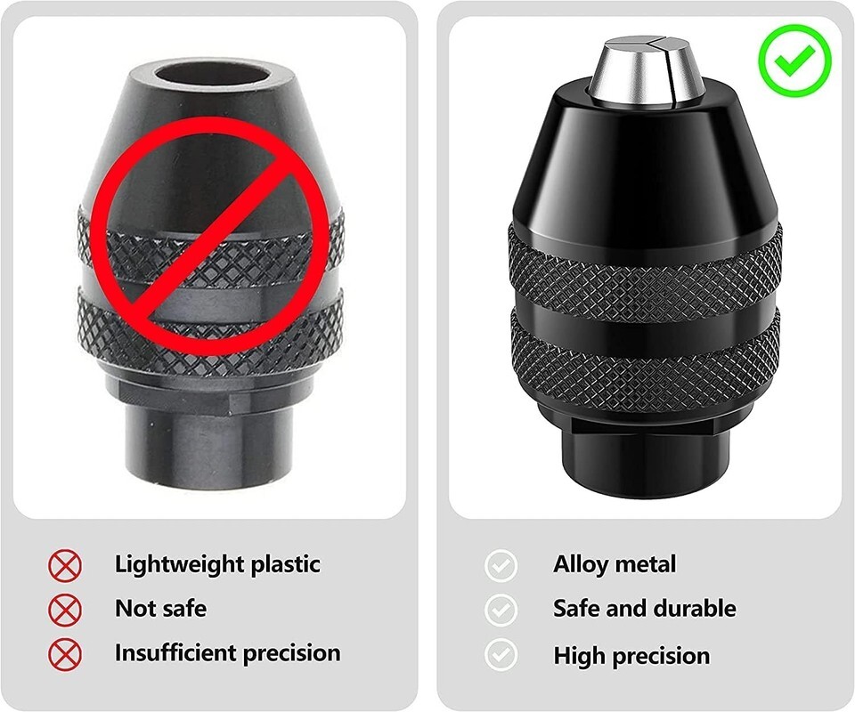 Features: Keyless Chuck,Quick Release Function,Quick change keyless chucks,Holds various accessories,1/32? to 1/8? shank sizes,3-jaw chuck,One-piece structure design,Alloy material,Sturdy and durable,Built-in spring stability,Improved precision,Better alignment with rotation,High-speed rotation stability,Improves work efficiency