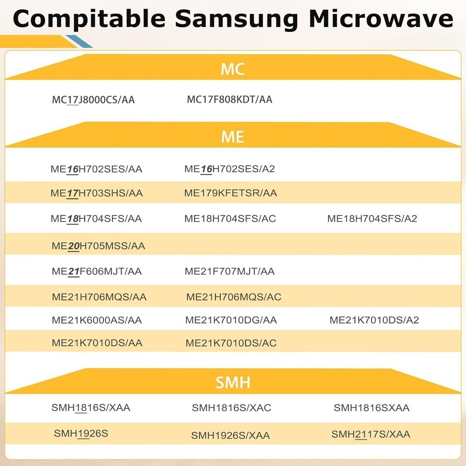 Fits models including MC17F808KDT, MC17J8000CS, ME16H702SES, ME179KFETSR, ME17H703SHS, ME18H704SFS, ME20H705MSS, ME21F606MJT, ME21F707MJT, ME21H706MQS, ME21K6000AS, ME21K7010DSS, MH1816S, SMH1926S, SMH2117S.