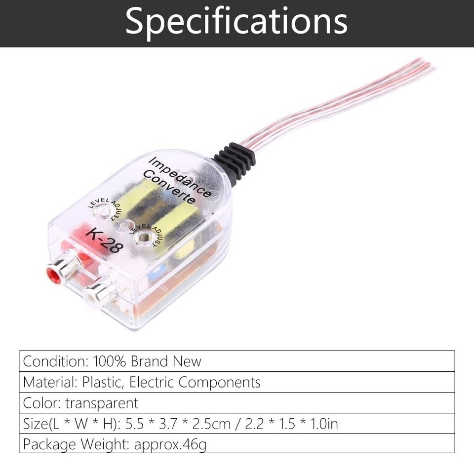 High to Low Car Audio Converter for Subwoofer Integration - Easy Plug Play ? ? ? ? ? ? ? ? ? ? ? ? ? ? ? ? ? ? ? ? ? ? High to Low Car Audio Converter for Subwoofer Integration - Easy Plug Play Installation Features: High Frequency Conversion: Effortlessly convert high-frequency speaker output to low-frequency output, perfect for connecting your car amplifier and subwoofer. Versatile Compatibility: Designed for car CD, VCD, and DVD players lacking low frequency outputs, ensuring a seamless integration into your sound system. Simplified Installation: With a compact design, our converter makes installation a breeze without compromising on performance. Receive Subwoofer Input: Ideal for adding a subwoofer where there is no output seat on the CD machine, enhancing your auditory experience. Guided Convenience: Each package includes a clear wiring diagram on the back, making it easy for anyone to install. Benefits: Transform your vehicle's audio with rich bass by integrating a subwoofer seamlessly. Enjoy high-fidelity sound with minimal effort and technical know-how. Clutter-free design allows for a streamlined installation process in any vehicle. Empower your driving experience with crystal-clear sound and robust bass response. No need for complicated wiring ? just plug in and enjoy. Why choose our High to Low Car Audio Converter? Are you seeking to elevate your car's audio system without a hassle? Our High to Low Car Audio Converter stands out as a superior solution, engineered to effortlessly bridge the gap between your car's audio output and subwoofer input. Experience an unparalleled sound transformation while enjoying easy installation and compatibility with various devices. Upgrade your ride's audio today ? the ultimate sound experience awaits with our premium High to Low Car Audio Converter. Order now and redefine your musical journey! Shipping Free Fast Shipping - We offer free shipping to most of the USA with a normal delivery time of 3-7 days. However, due to the current situation, additional delivery time (up to 3 weeks) may be required for some items. Alternative Carriers - We may use alternative carriers (e.g. USPS, FedEx, UPS, etc.) to ensure your package arrives safely and on time. Due to the use of multiple carriers, we are unable to provide a tracking number automatically. Handling Time - Orders are processed and shipped within 1-2 business days of receiving cleared payment. Shipping Restrictions - Shipping to Alaska, Hawaii, Puerto Rico, Guam, and other US territories may incur shipping charges or delivery restrictions. Please contact us before ordering, or your order can be refunded/cancelled. State Restrictions - There may be restrictions based on your state of purchase. For example, certain items may not be shipped to California due to state regulations. Contact for Tracking Updates - If you require tracking updates or have any concerns about the delivery of your order, please feel free to contact us, and we will be happy to assist you. Return 30-Day Hassle-Free Returns - We want you to be completely satisfied with your purchase. If you are not, you can return the item within 30 days of receiving it for a full refund or exchange. Easy Return Process - To start a return, simply contact us and we will provide you with a prepaid return shipping label and detailed instructions. Restocking Fee - There are no restocking fees for returns. However, the buyer is responsible for return shipping costs if the return is not due to a seller's error. Refund Processing Time - Refunds will be processed within 5 business days of receiving the returned item in its original condition. Payment We accept all major credit cards, PayPal, and Apple Pay for your convenience. Your payment information is secure and encrypted to ensure a safe and seamless transaction. Please complete your payment within 3 days of purchase to avoid any delays in shipping. Feedback Your feedback is extremely important to us. We strive to provide the best products and customer service possible. If you are satisfied with your purchase, please take a moment to leave us a positive review. If you have any concerns or issues with your order, please contact us before leaving negative feedback. We are committed to resolving any problems and ensuring your satisfaction. Contact Us If you have any questions or concerns, please feel free to reach out to our customer support team. You can contact us through the messaging system. We are available Monday to Friday, 9:00 am to 5:00 pm EST, and we will do our best to respond to your inquiry within 24 hours. Buy it now and enjoy a pleasant shopping experience! MPN: Car_Audio_Converter UPC: Not Set Model: Car Audio Converter Brand: Unbranded Type: Level Converter Country/Region of Manufacture: Car Audio Converter