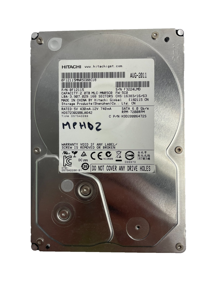 - Featuring: Hitachi Model HDS723020BLA642 Internal Hard Drive 2TB 7200 RPM Cache 64MB - Specifications: ---Model: HDS723020BLA642 (also known as 0F12115) ---Capacity: 2TB (2000GB) ---Form Factor: 3.5-inch ---Interface: SATA III (6Gb/s) ---Cache: 64MB ---Rotational Speed: 7200 RPM ---Recording Technology: Conventional Magnetic Recording (CMR) ---MTBF (Mean Time Between Failures): 1 million hours ---Workload Rate Limit: lt;55 TB/year