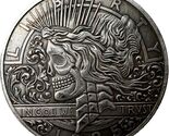 Discover a remarkable piece inspired by the tradition of Hobo Nickels with our Hobo Nickel Style Skull on a 1935 Peace Dollar Replica. This unique item showcases the artistry of coin carving, where talented artists transform original coins into captivating works of art. The original depiction of Lady Liberty on the 1935 American Peace Dollar has been dramatically altered into a haunting skull with decaying features, skillfully retaining the iconic rays of her crown. This striking design imparts a gothic, almost apocalyptic character to the coin, enhanced by ornamental engravings along its edges that are characteristic of Hobo Nickel craftsmanship. The reverse side preserves the original design, featuring an eagle perched on a rock, clutching an olive branch while proudly displaying the word "PEACE."While this engraved dollar is not an official minting, it stands as an excellent example of meticulous artistry that bridges the realms of numismatics and skillful craftsmanship. With a diameter of 38 mm and a thickness of 2.5 mm, this collectible piece is a must-have for both coin enthusiasts and art lovers alike. Embrace the spirit of Hobo Nickel artistry and add this stunning replica to your collection today.