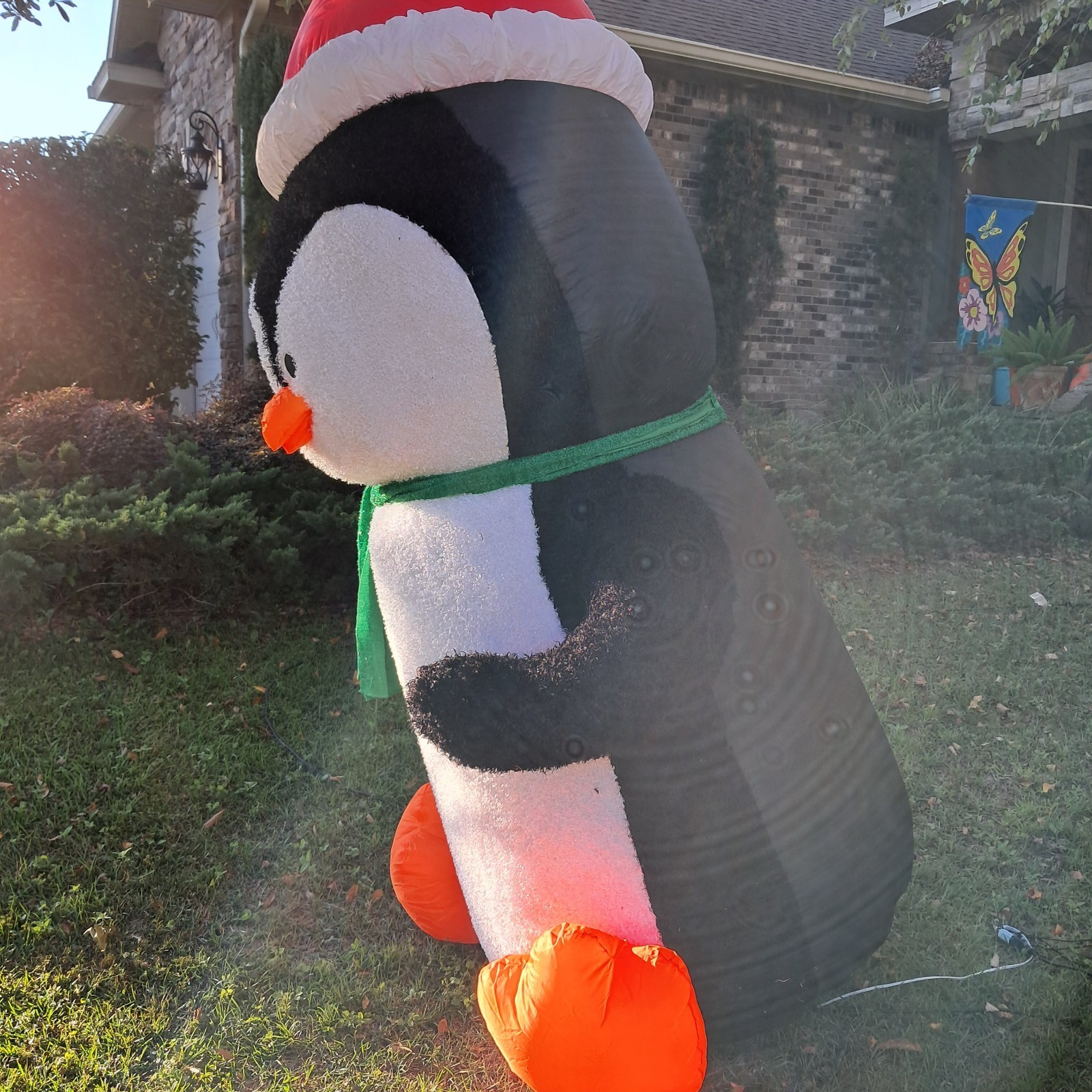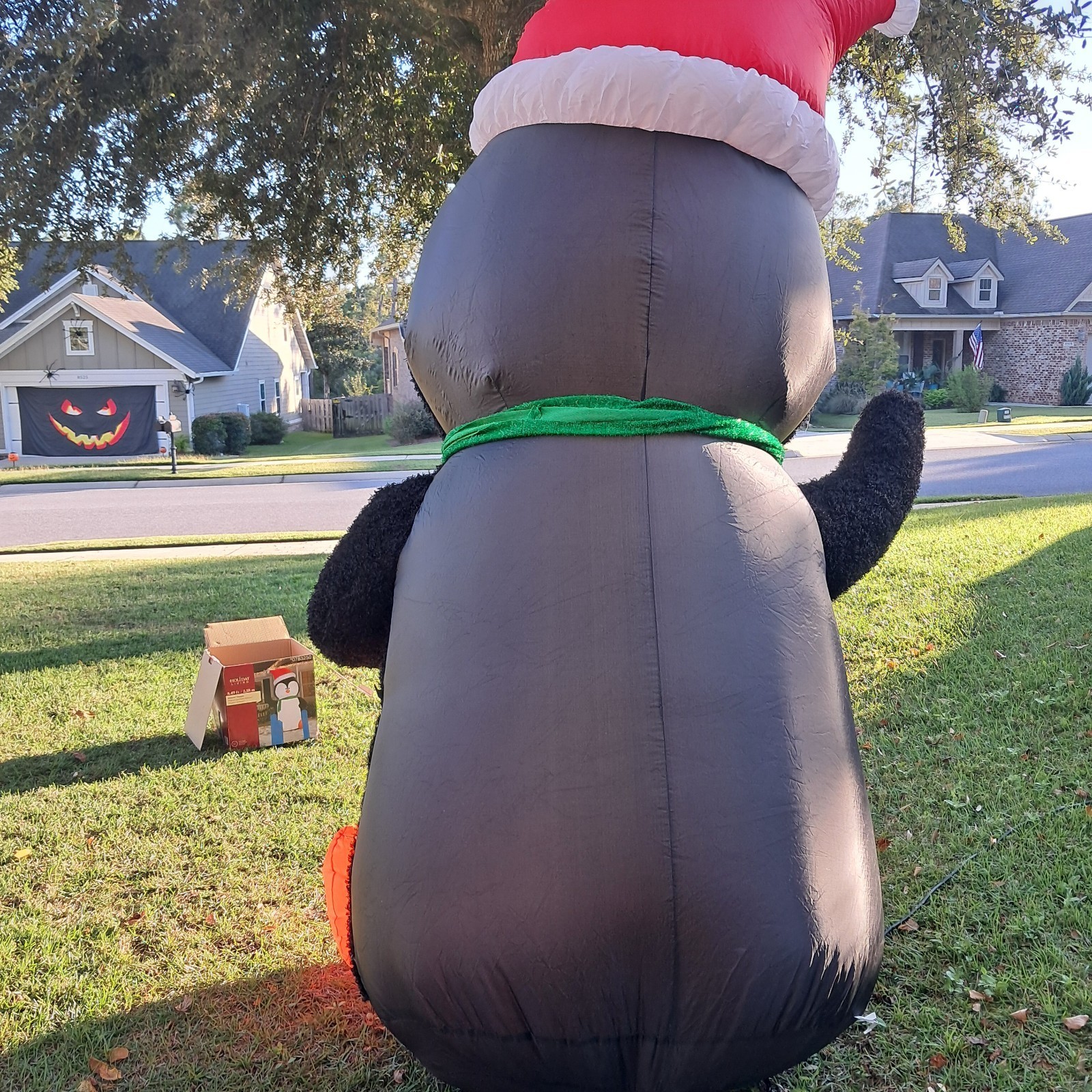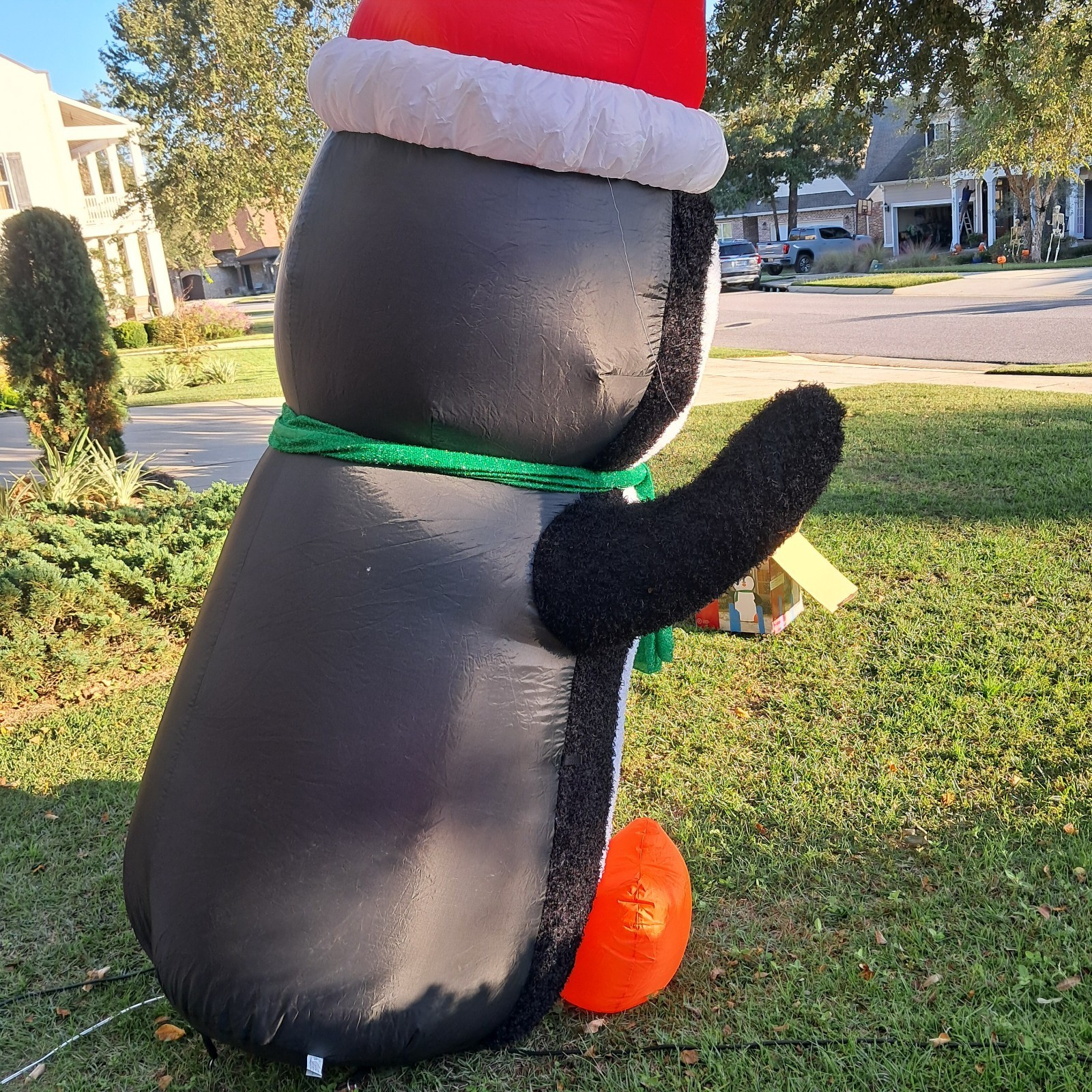 Holiday Living Gemmy Christmas 8.49' Penguin Santa Hat Airblown Inflatable fuzzy Fuzzy on one side. Tear at the bottom, but it does inflate fully. Some minor grass/debris in the fuzzy part from use. Does not include stakes. Box has wear as shown.