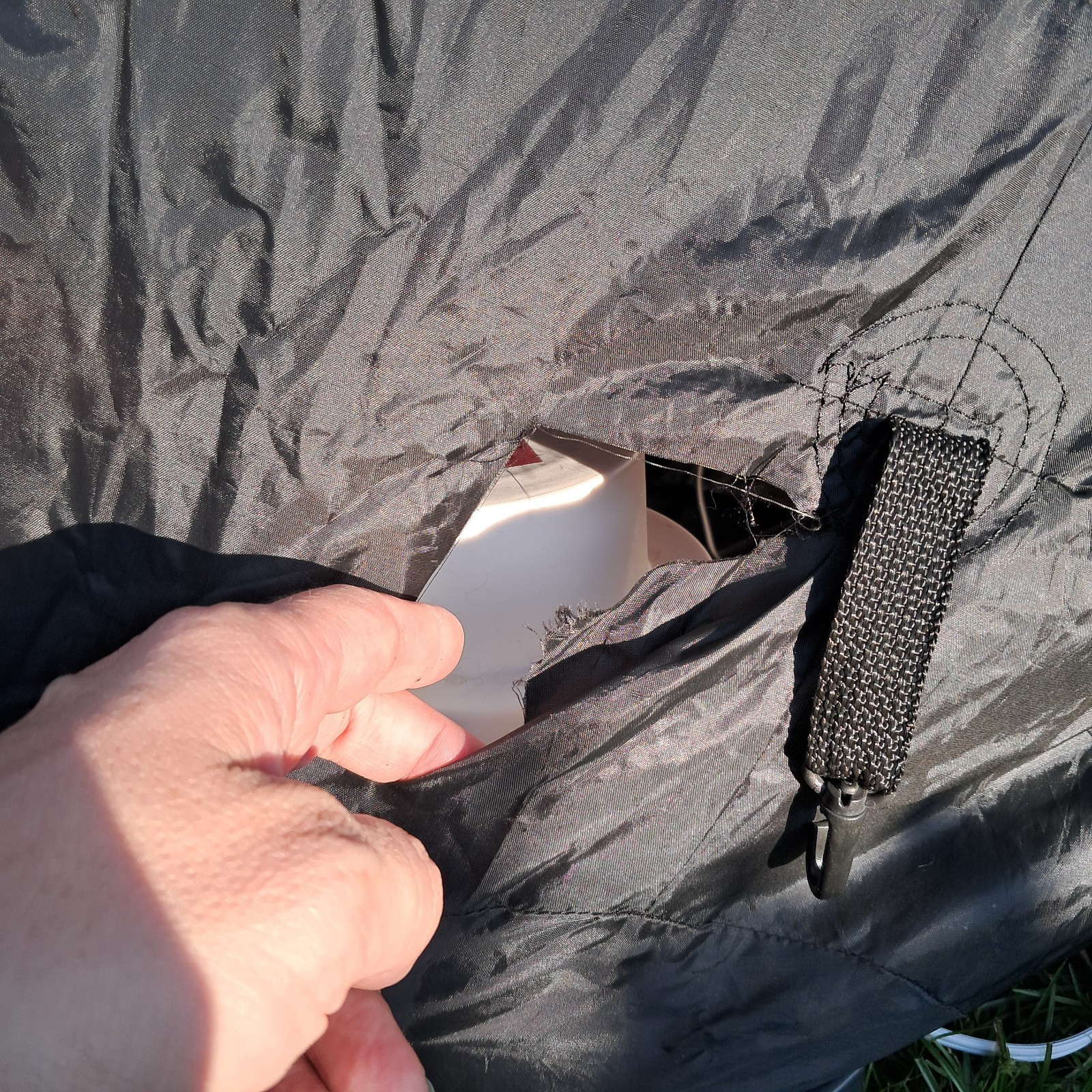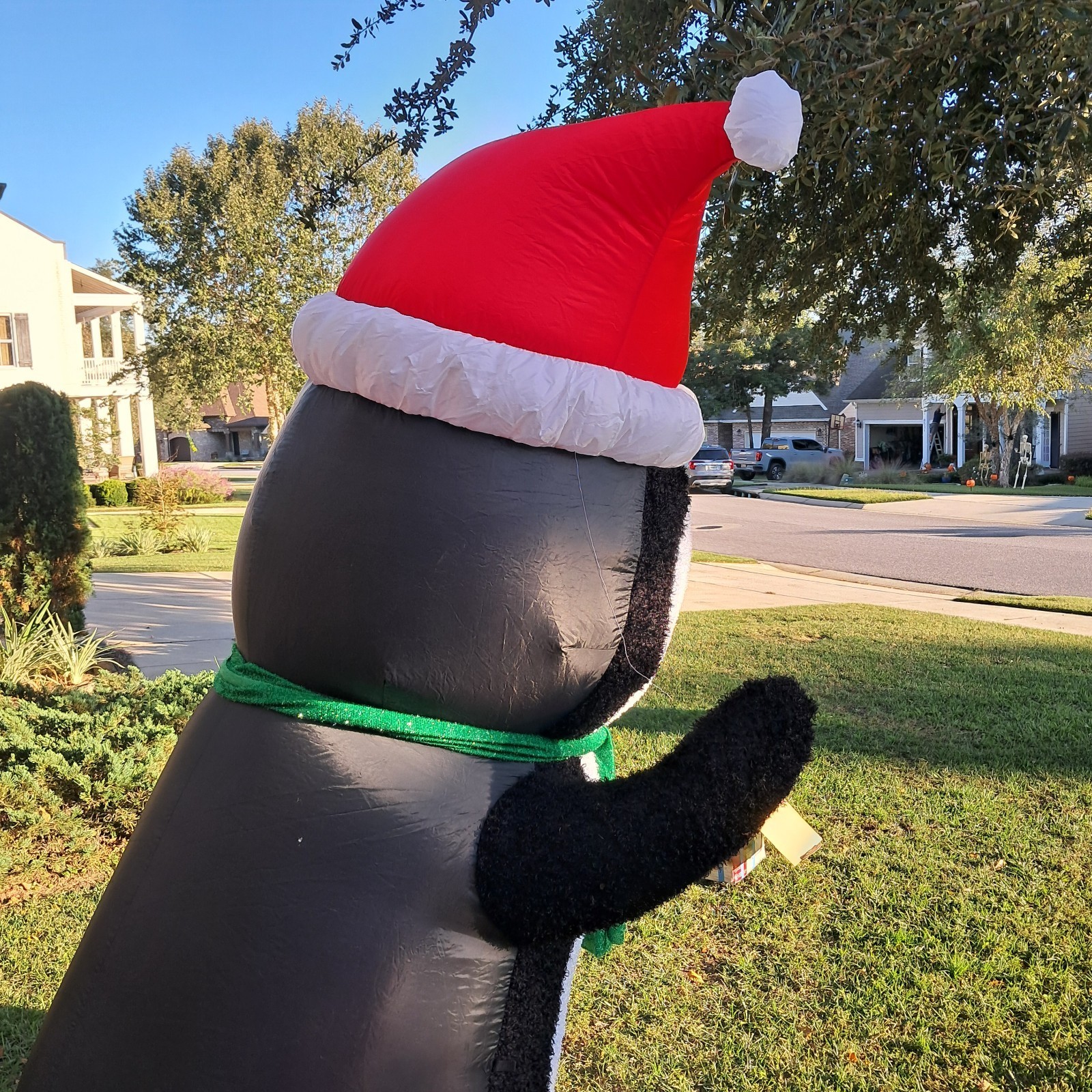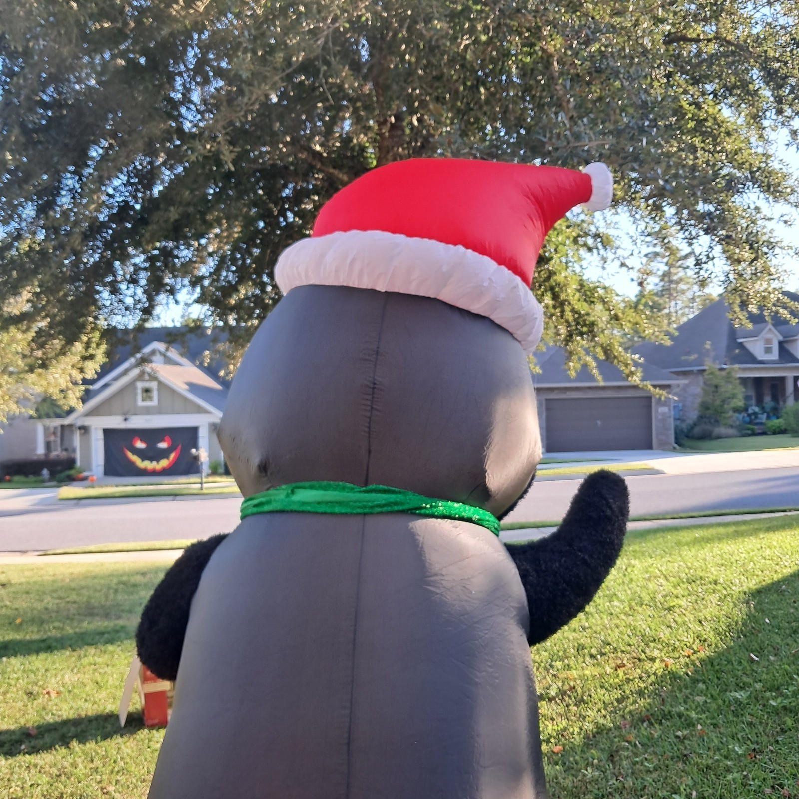Holiday Living Gemmy Christmas 8.49' Penguin Santa Hat Airblown Inflatable fuzzy Fuzzy on one side. Tear at the bottom, but it does inflate fully. Some minor grass/debris in the fuzzy part from use. Does not include stakes. Box has wear as shown.
