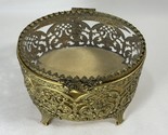 This is a really neat little glass and metal trinket box, perfect for your dresser top. Measures approx 4 1/4 x 4 oval x 3" tall. I take pride in my pictures, and are a valuable extension of my description. Please take time to see the product fully. Buy with confidence! All items are packaged with great care and shipped next day, excluding any weekends and holidays. I will combine shipping whenever possible as long as the products can be safely packed together. Please remember to leave feedback, it helps to keep good sellers . International Buyers: We do not mark merchandise as a gift or below value due to it being against US and International Regulations. All custom fees and duties are the responsibility of the buyer. Seller is not responsible for any package held by Customs. If returns are accepted. Must be returned in the same condition as received and in same or similar packaging.