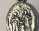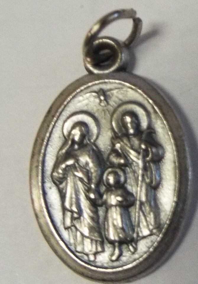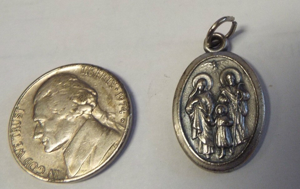 You are purchasing a medal of the Holy Family (Jesus,Mary Joseph) on one side and the Holy Spirit on the other side. It is silver tone metal. Please see picture for approximate size.