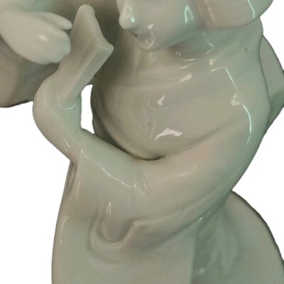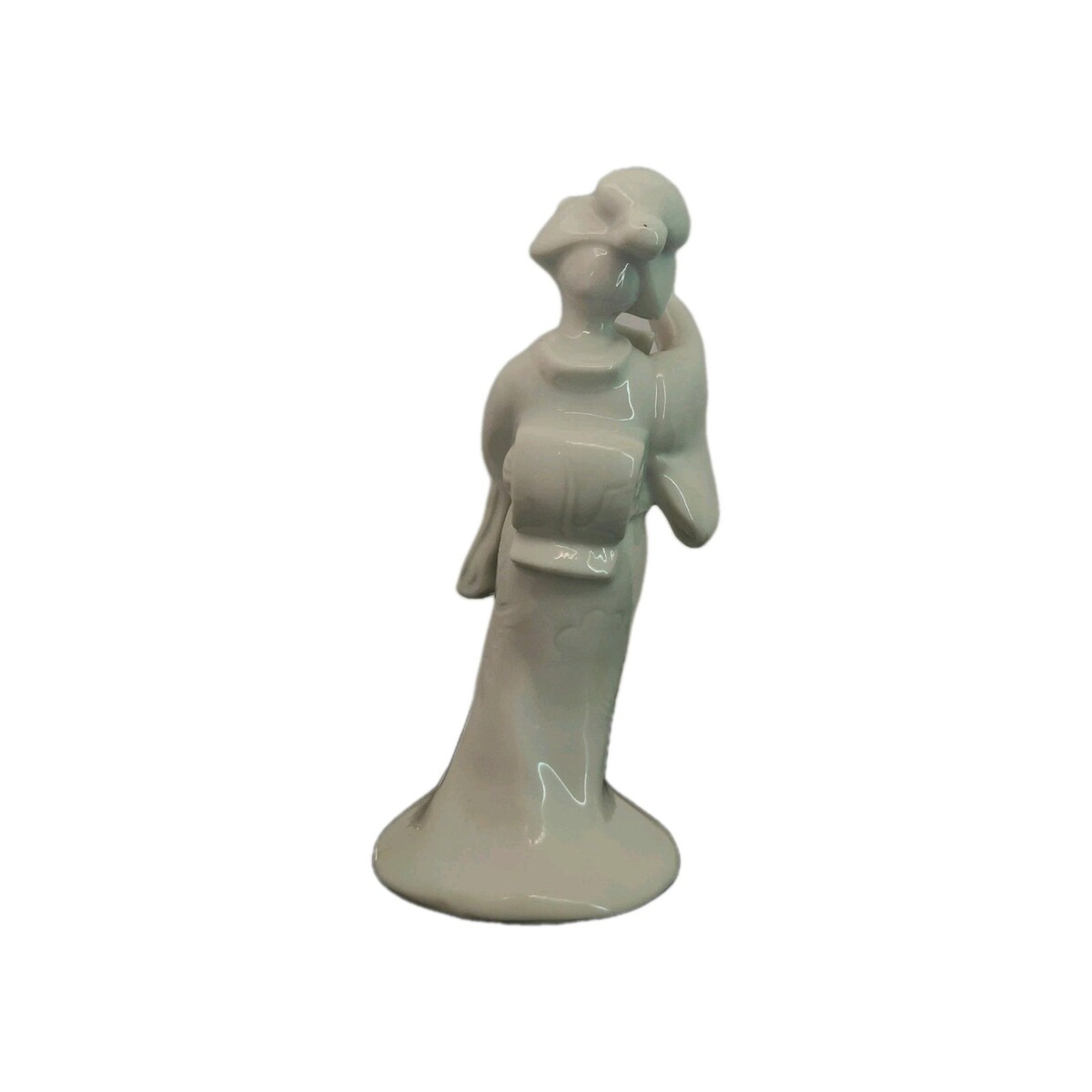 The product is a Homco White Porcelain Geisha Dancing with Fan Figurine that stands at 7 inches tall. This intricately detailed figurine depicts a Geisha in a graceful dancing pose, holding a fan. Made of white porcelain with a glazed finish, this collectible item is ideal for all occasions and would make a beautiful addition to any decor, especially for those who appreciate Asian periods and styles. Crafted in Taiwan by the brand Homco, this figurine is a perfect representation of elegance and culture.