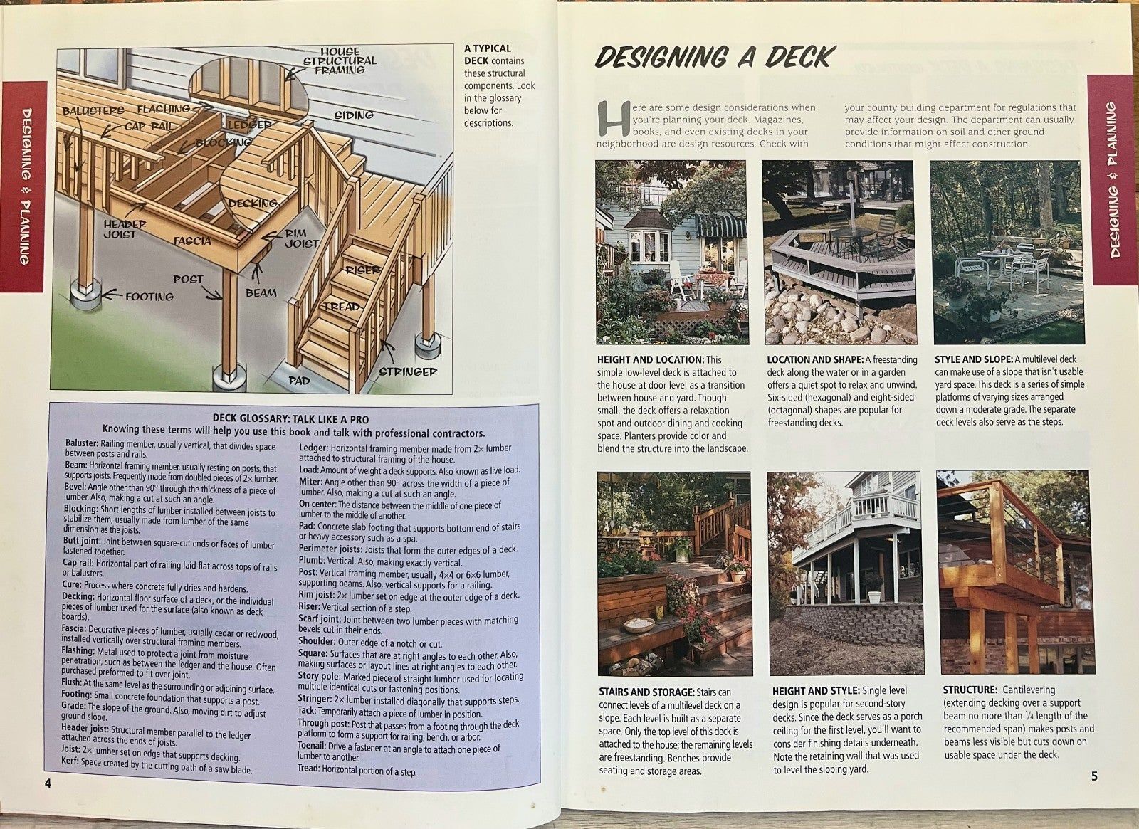 In great condition with minor cover wear from use and storage. Tons in here on building, maintaining and repairing all kinds of decks ***Disclaimer on old/vintage/antique books/paper and the like: Some wear from age, use and storage which may or may not include some, none or all of the following: writing/personalized notes on inside covers and title pages(or notes on pages in the case of songbooks and sheet Music), small tears, creasing, etc.... all typical Vintage and antique book wear. See top of description for any outstanding flaws. **All items pictured are fully usable and/or functional unless otherwise noted** Inspect pics closely and ask any questions before buying or offering. Tons more toys, collectibles, paper, antique, vintage ephemera, maps, engravings, prints, vinyl, vhs, media, books, bags, handmade and more! Will combine shipping!