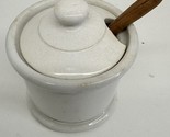 HAS A CHIP IN THE LID. This vintage Homer Laughlin Pottery condiment bowl with wooden spoon is a rare find for collectors of restaurant ware. The bowl features a classic design that is perfect for any kitchen or dining room. Crafted from high-quality materials, this bowl is durable and long-lasting.