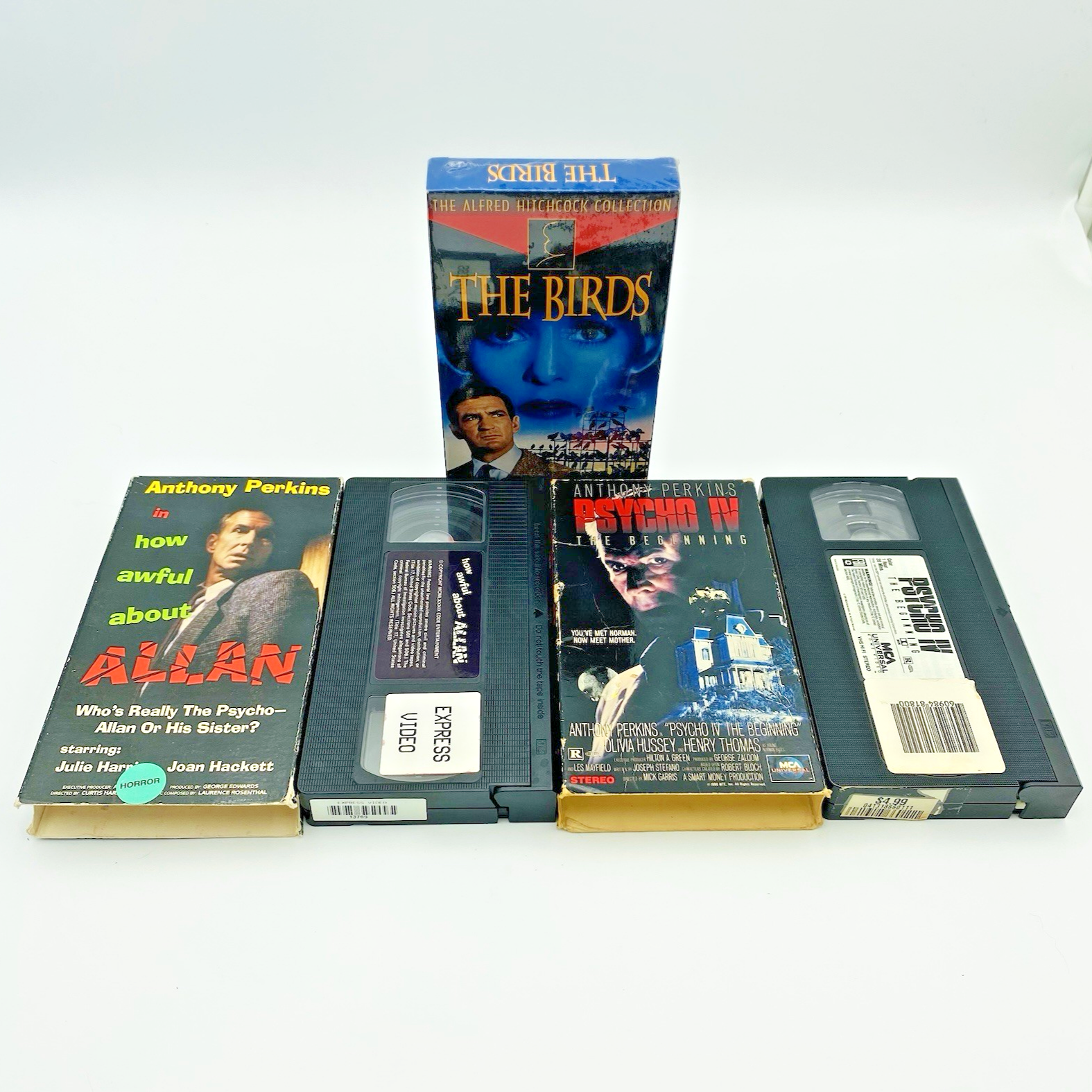 This horror VHS lot includes the following films ?Psycho IV", ?How Awful About Allan? and "The Birds?. The Birds comes in brand new, factory sealed condition. Psycho IV and How Awful About Allan come complete with box. Boxes have some moderate to heavy wear. Both tapes are in good condition, have been tested and play on my player. Both have stickers present as well. Please see pictures for more details. Be sure to check out my store for more. Add 3 or more items to cart and save 20%! Thanks for viewing.