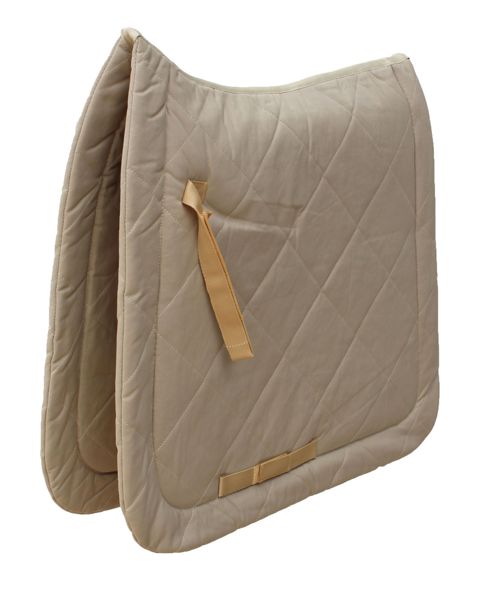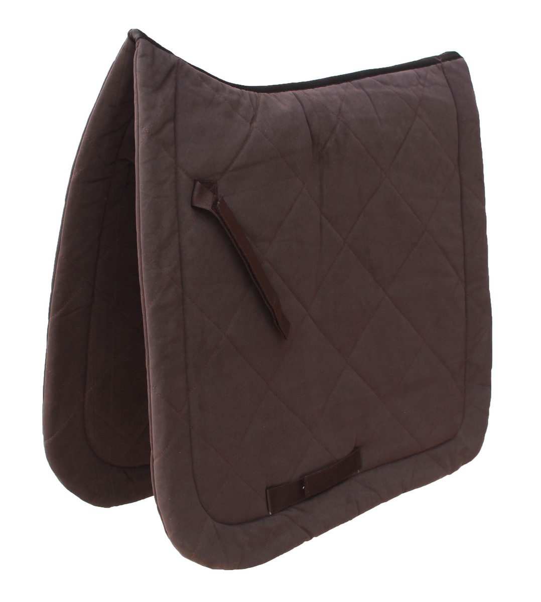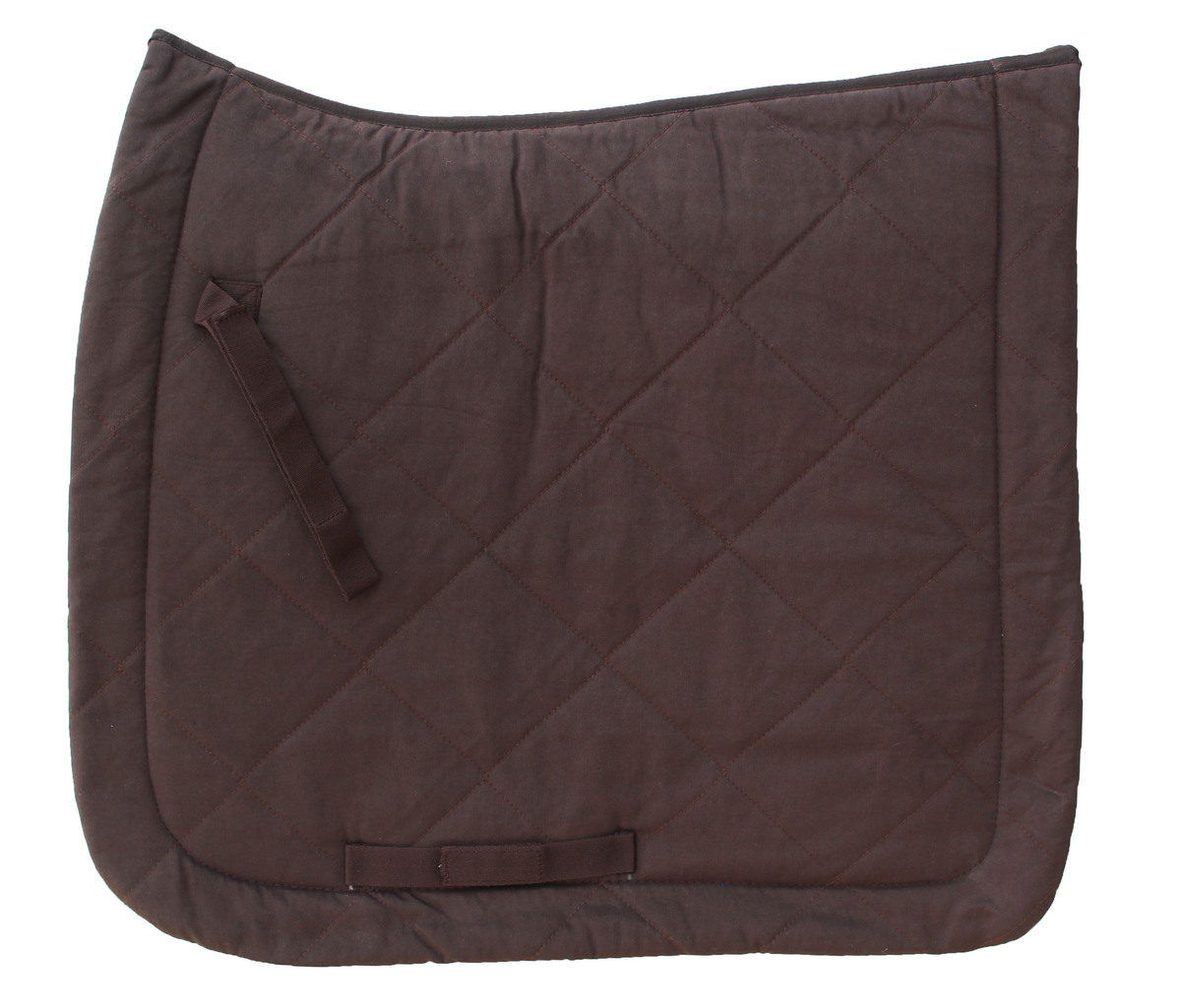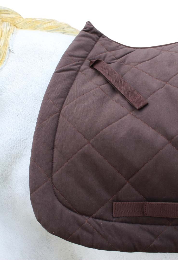 Classic contoured all-purpose English saddle pad. Made from heavy-duty cotton twill 4" diamond quilted pattern. Nylon girth loops and Velcro billet straps to prevent tack from shifting. Pad measures 22" (Spine) x 21" (Drop).