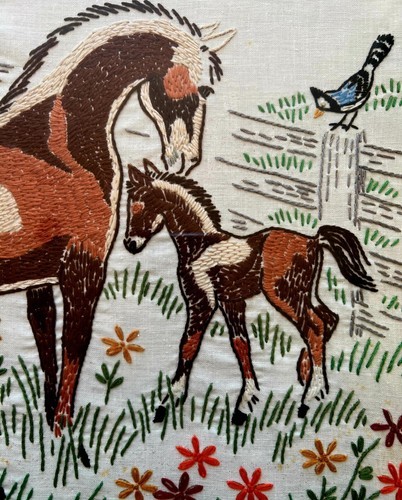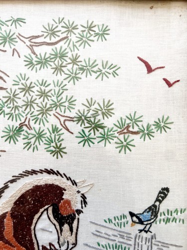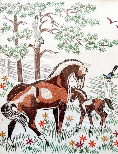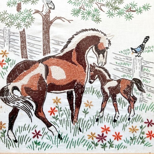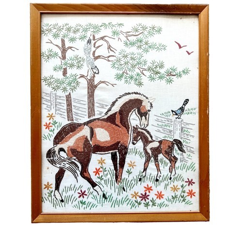 Horses On Farm Thread Yarn Art Framed 1960-70s Antique Original Artwork SS