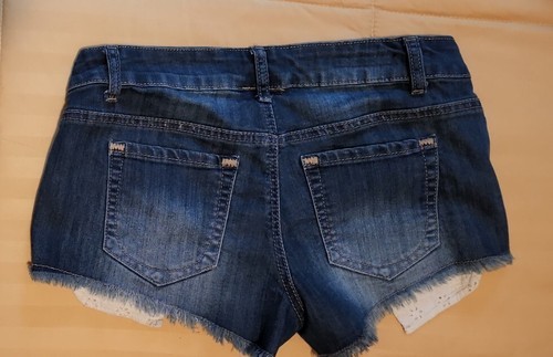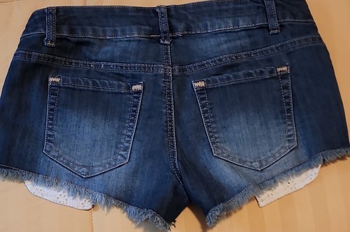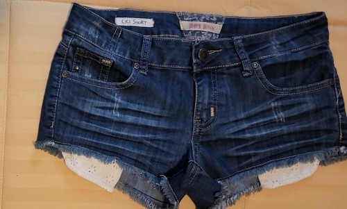 This sale is for One (1) Pair of Hot Kiss Brand Denim Shorts Juniors' Size 5 Waist 27" 69% Cotton ~ 30% Polyester ~ 1% Spandex Flat front Fringe hemline w/ivory colored faux pockets Five (5) pocket design Belt loops around waistband Navy blue in color Low Rise ~ Measures approximately 7.5" Measures approximately 8" length on side seam Inseam measures approximately 2" Zipper fly with one (1) button closure Machine wash ~ Tumble dry Shorts are in good ~ pre-owned condition Please view photos for a good description of these shorts Thank you!