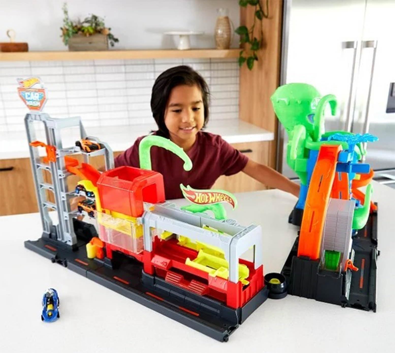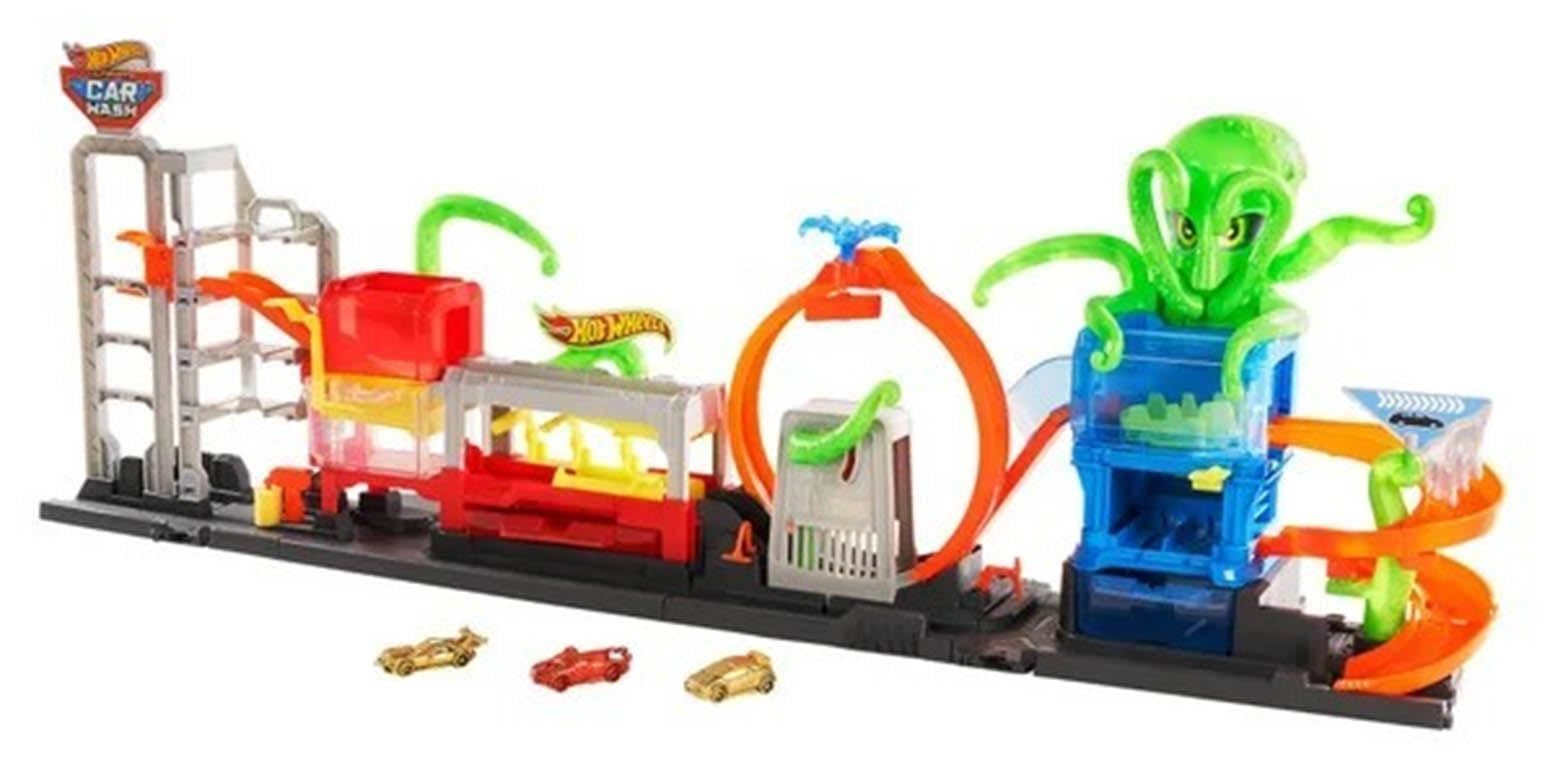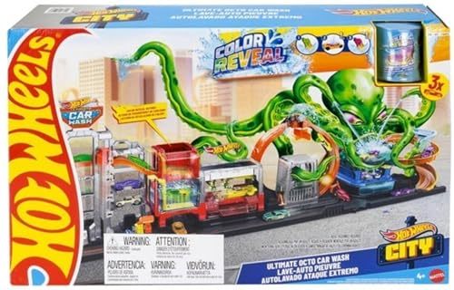 Hot Wheels Huge Play Set: City Ultimate Octo Car Wash With 3 Color Reveal Cars. Features: Includes 3 Color Reveal Die-cast Cars The Style of Color Reveal Cars May Vary Self-contained Playset that Extends 4ft Two Separate Water Tanks Facilitate the Color-shifting Features Recommended Ages: 4+ Product Details The Hot Wheels City Ultimate Octo Car Wash is packed with 4ft of awesome features and comes with three cars that offer multiple surprises to make kids want to visit again and again! Straight out of the box, the Color Reveal vehicles are covered in a color coating to kick off the adventures. Fill the first water tank with water, drop a car in, and swirl it around for the initial reveal: a cool Hot Wheels vehicle with a totally sweet deco! Run the car through the set -- that includes a loop -- letting excess water drain off while admiring the car's awesome details. Before the final wash, fill the octopus's head with cold water and spray the car through the tentacles to reveal another entirely different deco! Use warm water to change it back. Run the cars through the car wash and repeat over and over again to see it switch between the last two color changes! Kids will love the action and transformation. Parents will love the ability to fold it in half for compact storage. WARNING! CHOKING HAZARD. Small parts. Not for children under 3 years.